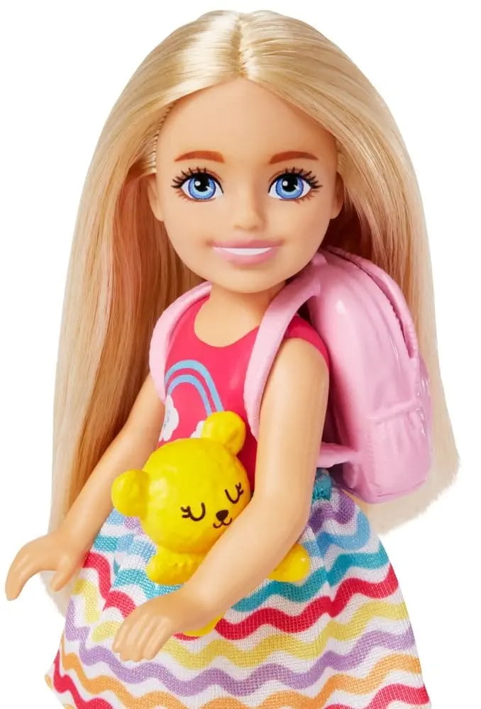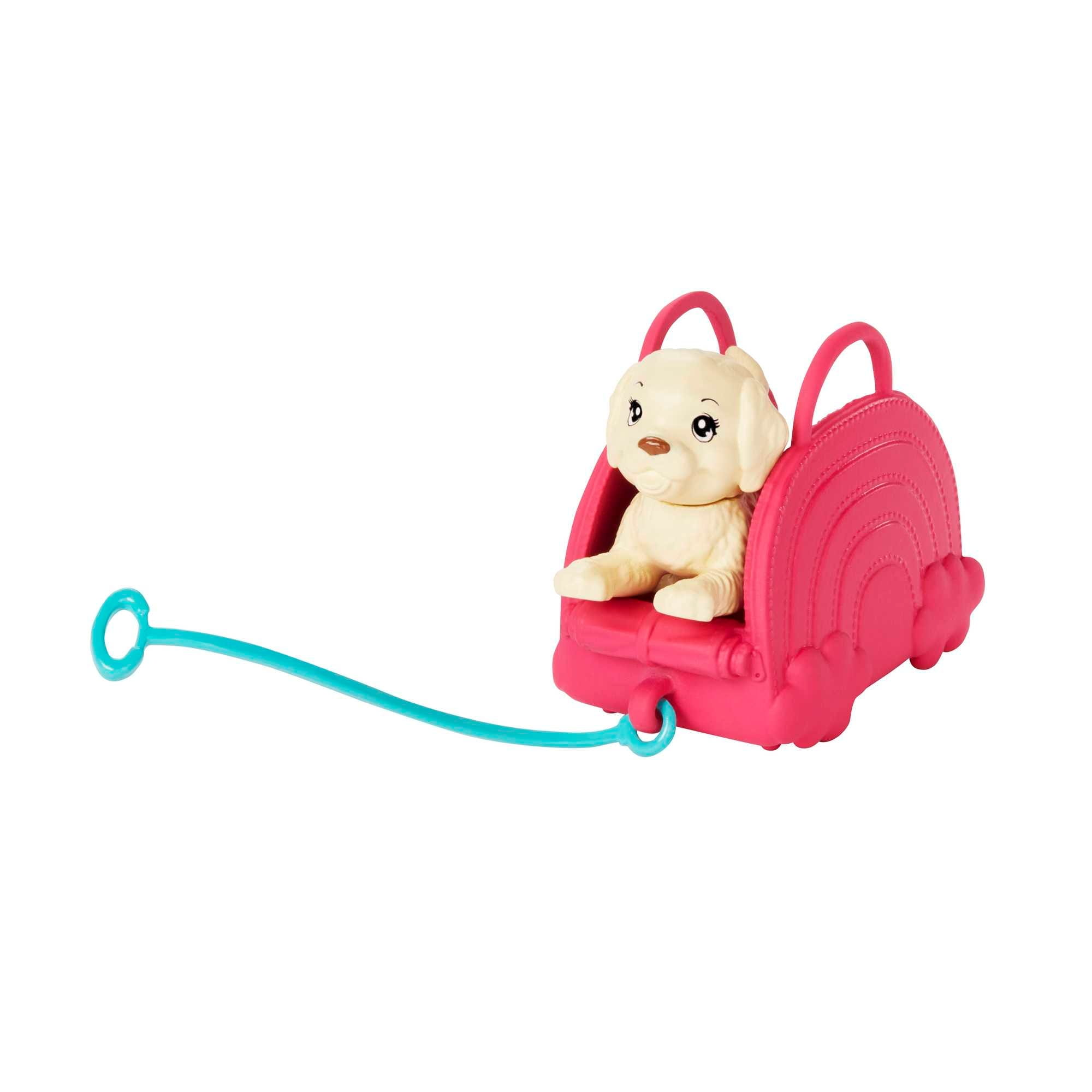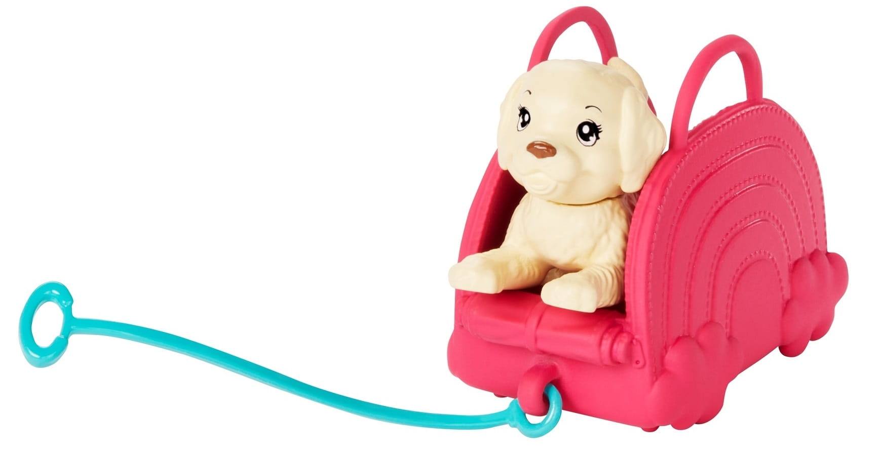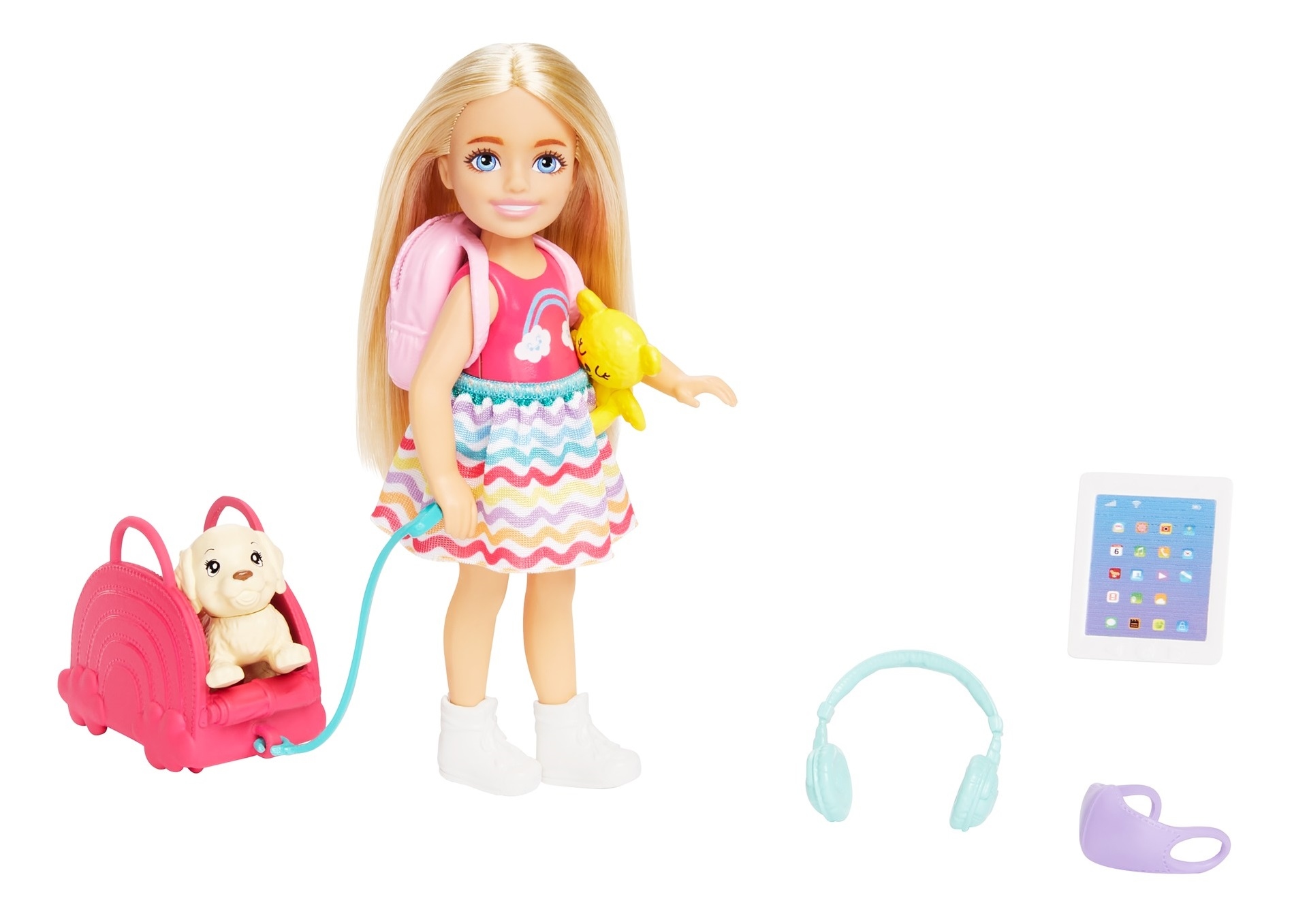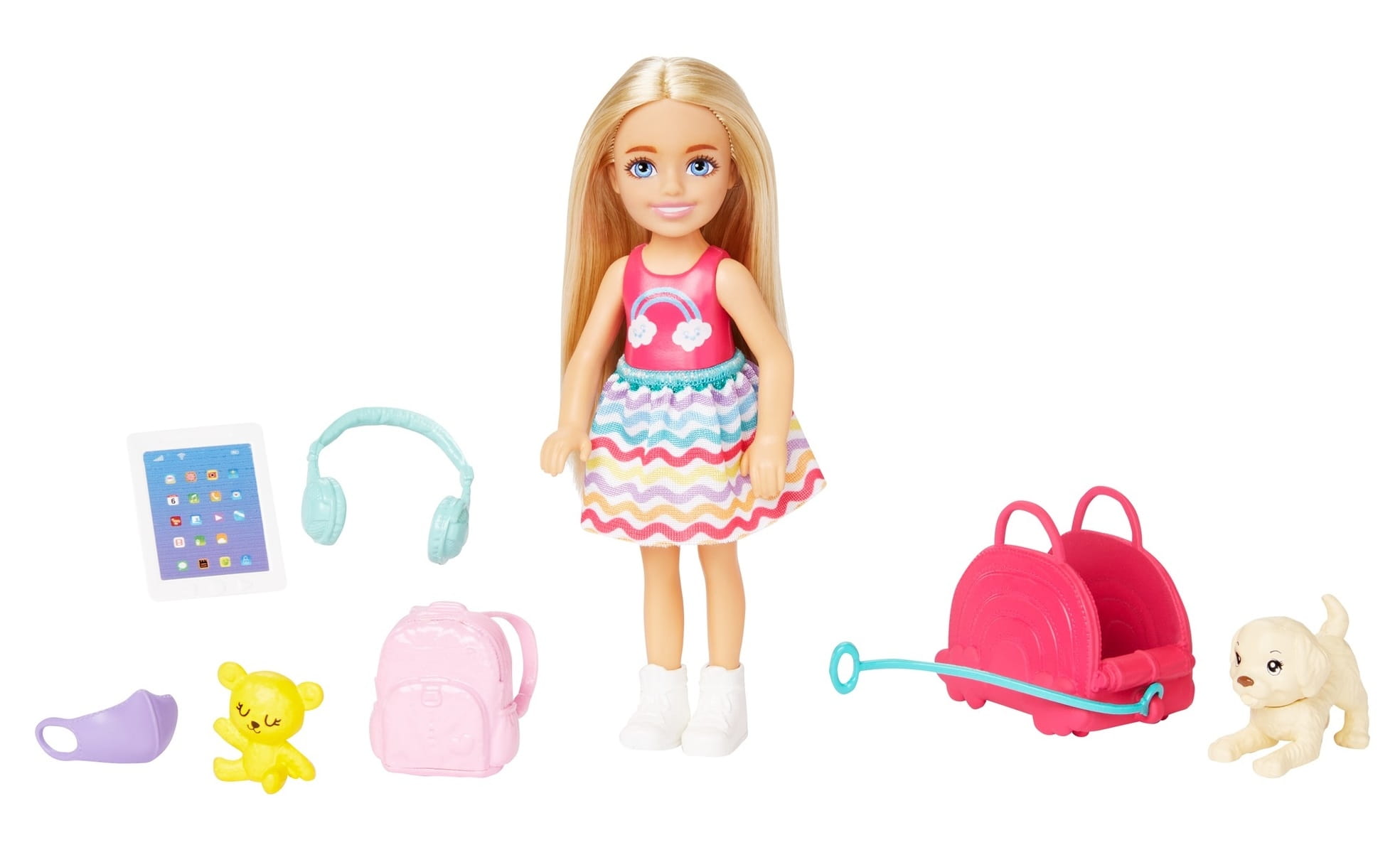 Młodsza siostra lalka Chelsea™ jest gotowa wyruszyć w kolejne miejsce ze swoim szczeniakiem i sześcioma akcesoriami podróżnymi, w tym transporterem dla zwierząt.