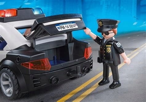 Samochód policyjny 5673. Ze światłem oraz otwieranym bagażnikiem i zdejmowanym dachem. Dodatkowo w zestawie znajdują się 2 figurki policjantów.