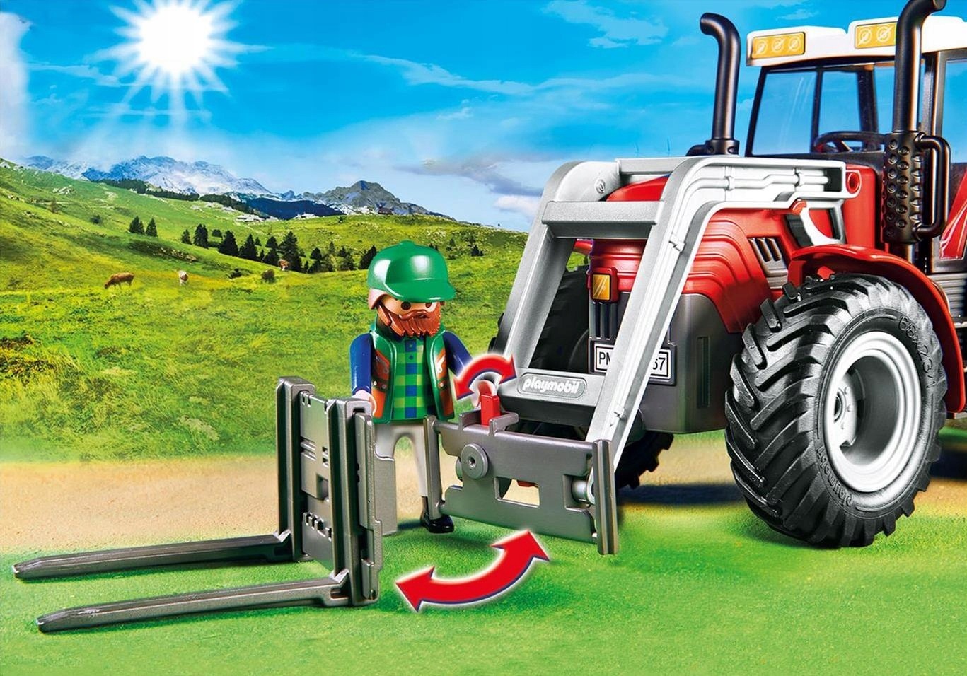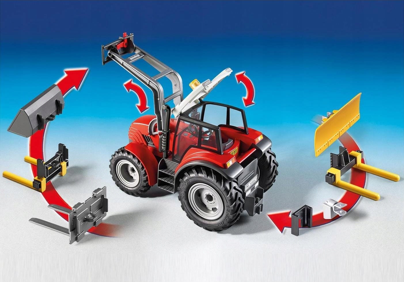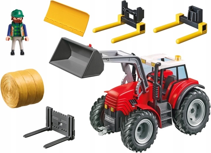W gospodarstwie rolnym traktor to niemal najważniejsza maszyna, bez której praca byłaby niezwykle trudna i mozolna. Czerwony traktor wyposażony został w ruchomą łyżkę, a także w podnośnik do słomy i spychacz. Może także pełnić funkcję widlaka. Zawartość zestawu: czerwony traktor z miejscem dla kierowcy, widlak, podnośnik ruchoma łyżka, widlak montowany z przodu w miejscu łyżki 2 pary wideł do transportu słomy i siana, montowane z przodu i z tyłu ciągnika 2 okrągłe bele słomy.