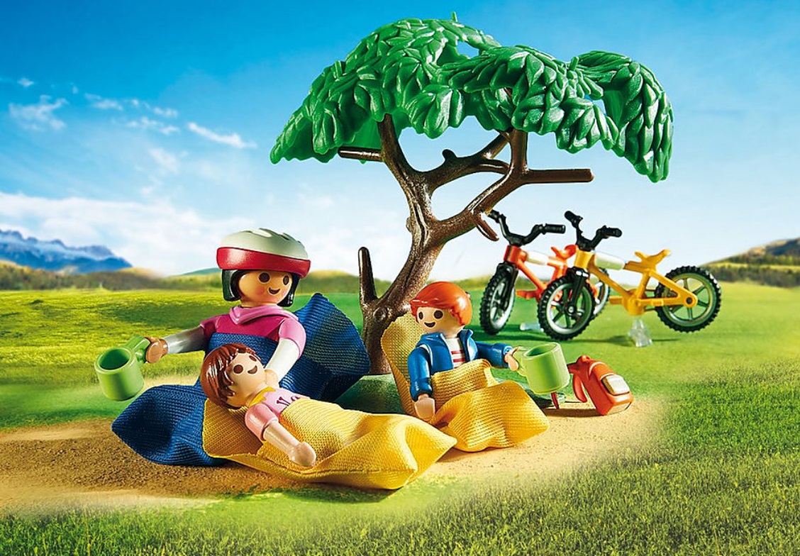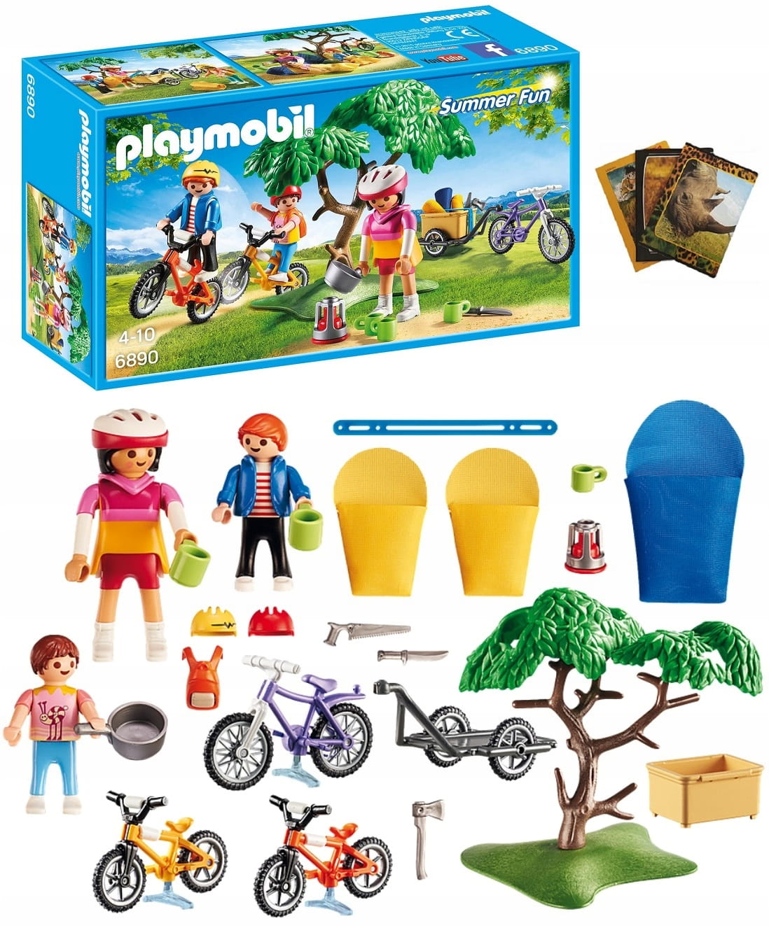 Dobrze wyposażeni w kaski rowerowe i mnóstwo prowiantu rozpoczyna się wycieczka na rowerze górskim. Dzieci nie mogą się doczekać, aby przetestować swoje nowe rowery. Ponieważ z wycieczki nie wrócą do jutra, spakowali też śpiwory, kuchenki kempingowe i garnki. Zestaw zabawek składa się z figurki PLAYMOBIL i dwóch figurek dzieci, roweru górskiego i dwóch dziecięcych rowerów górskich, dwóch małych śpiworów, trzech kasków ochronnych, trzech kubków, kuchenki kempingowej i innych wspaniałych dodatków na ekscytujące godziny zabawy.