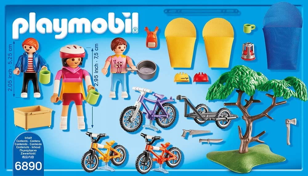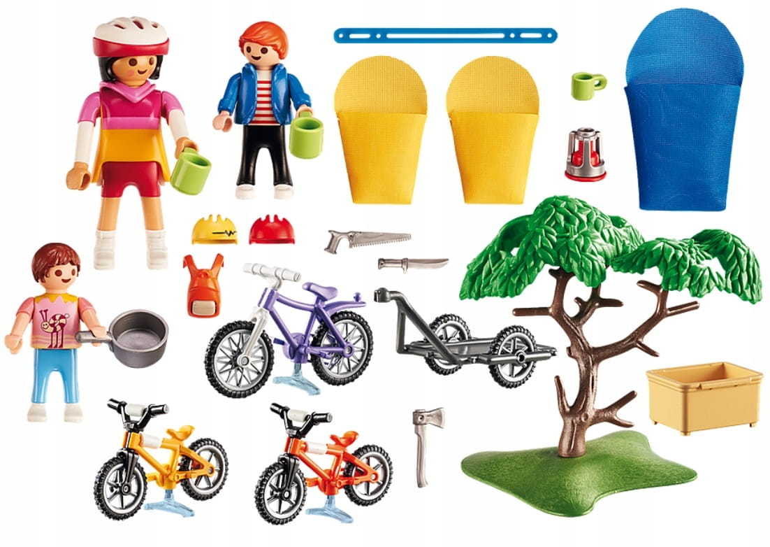 - Akcesoria: 1 teren zielony z drzewem, 1 rower górski, 2 rowery górskie dla dzieci, 3 stojaki na rowery górskie, 1 przyczepka do rowerów górskich, 2 małe śpiwory, 1 duży śpiwór, 1 pudełko, 1 siekiera, 1 nóż, 1 piła, 3 kaski ochronne, 1 plecak, 1 garnek, 1 kuchenka kempingowa, 3 kubki, 1 pasek mocujący.