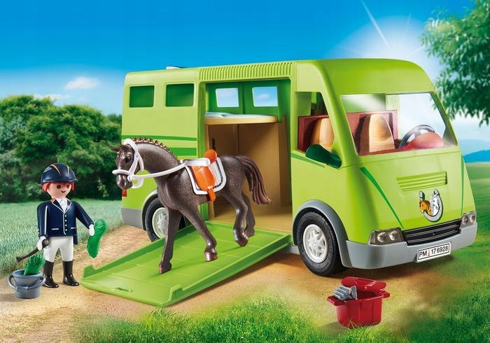 Playmobil Country Pojazd do przewozu koni 6928 to zestaw z dużym i funkcjonalnym samochodem, którym jeździec i koń mogą wygodnie podróżować na wystawy i konkursy, aby zdobywać kolejne nagrody. Zdejmowany dach ułatwia umieszczenia jeźdźca za kierownicą lub położenie do łóżka by mógł odpocząć po męczącej drodze. Otwierane boczne drzwi zapewnią wierzchowcowi wygodne wchodzenie do samochodu. W pojemnym otwieranym bagażniku zmieszczą się siodło, ogłowie, derka oraz wszystkie przedmioty, których jeździec potrzebuje, by dobrze dbać o swojego ulubieńca. Zestaw zawiera wszytko czego potrzebujesz do wyruszenia w kolejną podróż marzeń.