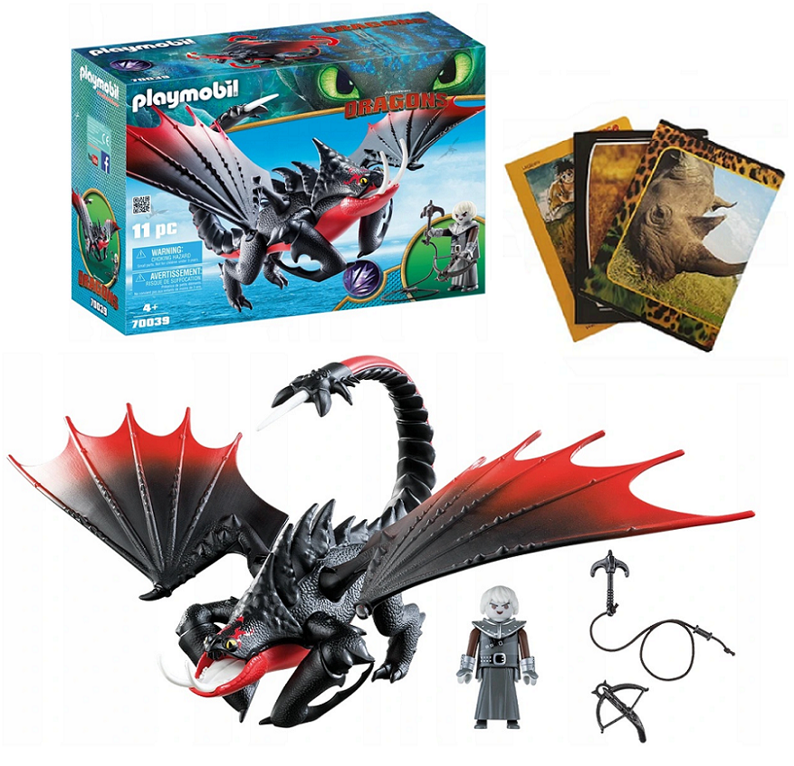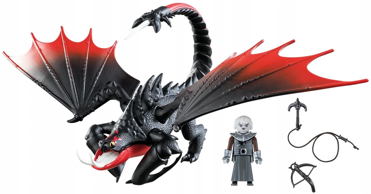 Śmierciozaur i Grimmel 70039. Odtwórz swoje ulubione sceny z filmu lub stwórz własne! Zestaw zawiera figurkę Grimmel'a, który może siedzieć, stać, ruszać rękami oraz obracać głową. A także figurkę smoka - Śmierciozaur, łuk i inne akcesoria tematyczne. Dzieci mogą bawić się tym zestawem samodzielnie lub łączyć z innymi zestawami Playmobil, co daje możliwość tworzenia nowych wątków podczas zabawy.