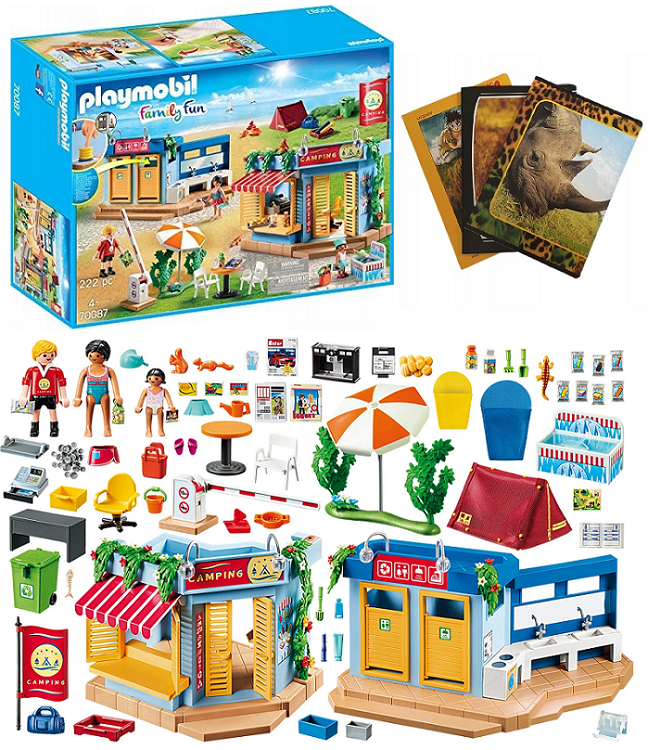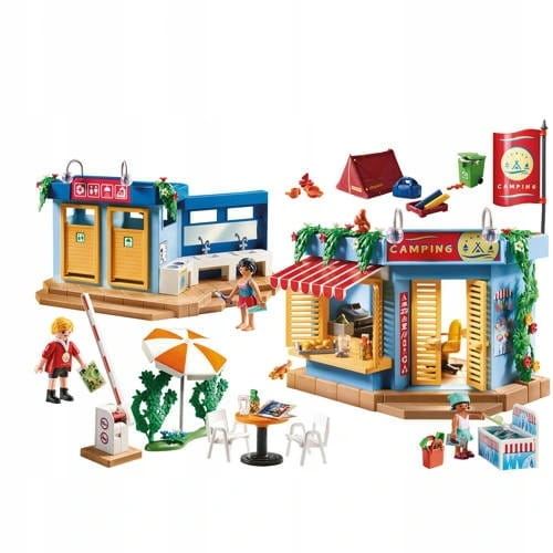 Nowe zestawy zabaw kempingowych od PLAYMOBIL® tworzą prawdziwe uczucie biwakowania. Po przybyciu rodziny na kemping, wszystko musi zostać zbudowane w pierwszej kolejności. Oprócz kiosku z dużym wyborem świeżej żywności i napojów, jest także wygodny zespół sanitarny. Prysznic, toaleta, umywalka, pralka wszystko jest dostępne. Teraz, gdy namiot jest ustawiony, można iść się bawić. Świetna wakacyjna zabawa na kempingu ponieważ oprócz budynku rejestracyjnego, kiosku oraz budynku sanitarnego z funkcjonalnym prysznicem zestaw do zabawy zawiera stół bistro z krzesłami, trzy figurki PLAYMOBIL®, namiot, zabawki z piasku i wiele innych dodatków.