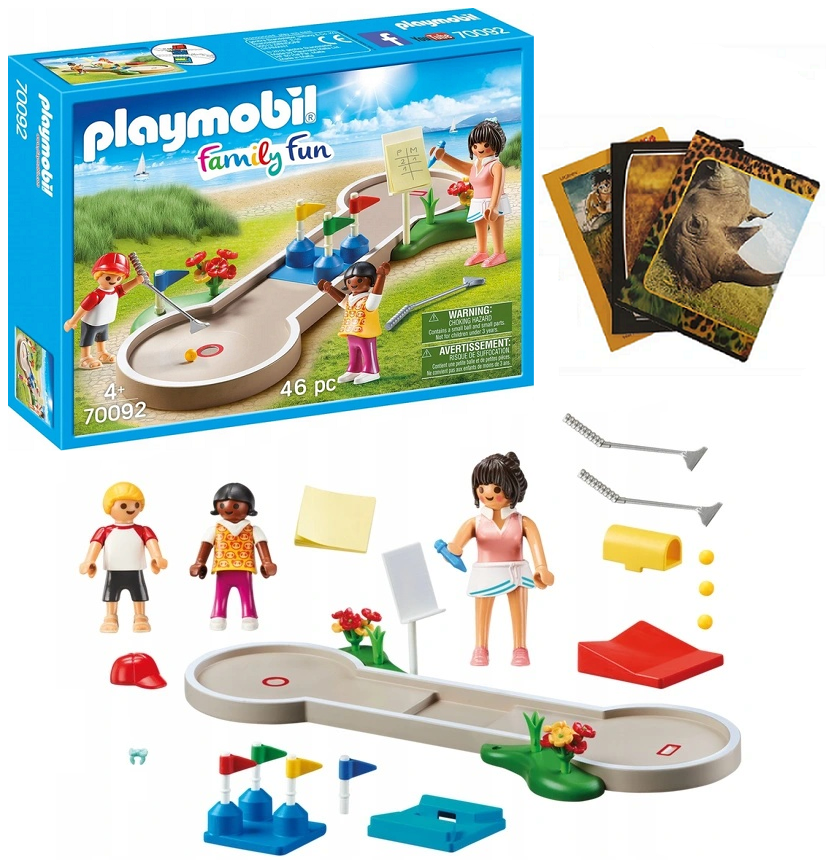 Pole do minigolfa to najnowsza propozycja klocków Playmobil z serii Family Fun, która zagwarantuje wiele godzin fantastycznej zabawy! Wewnątrz opakowania znajduje się 46 elementów, które pozwalają na złożenie w pełni wyposażonego niewielkiego pola do gry w minigolfa. Do dyspozycji graczy są również pachołki z chorągiewkami do oznaczania odległości, dwa kije golfowe, tunel, powierzchnia pochyła oraz trzy piłeczki. Instruktorka przekazuje dwóm uczniom wszystkie potrzebne informacje. Chłopiec i dziewczynka pilnie słuchają wszystkich rad, by zyskać miano w pełni wykwalifikowanych graczy.