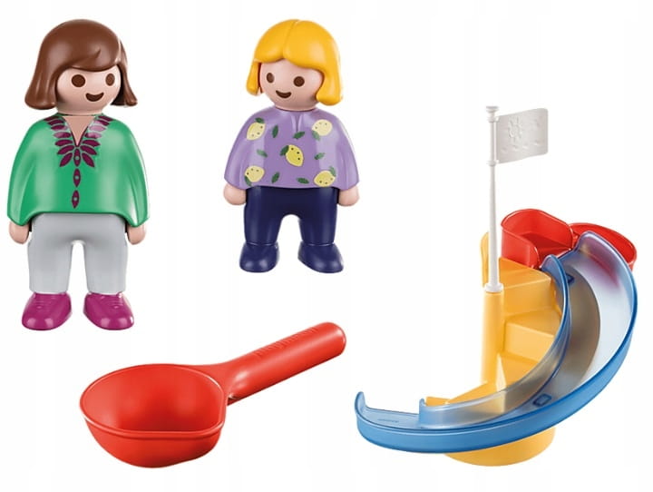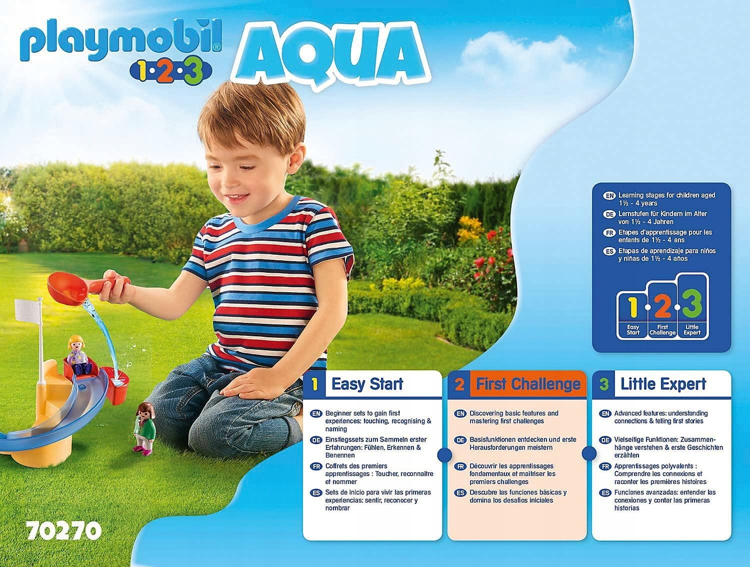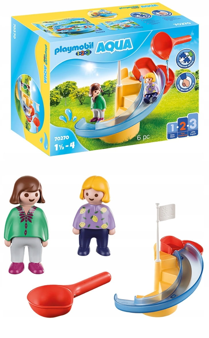 Zjeżdżalnia wodna PLAYMOBIL 1.2.3 AQUA zapewnia jeszcze więcej radości z pluskania się. Najpierw wchodzi się po zjeżdżalni, potem trzeba kadzią nalać wodę do pojemnika obok siedzenia. Jeśli w pojemniku jest wystarczająco dużo wody, siedzenie przechyla się i zaczyna się wesoła zjeżdżalnia. Małymi krokami do wielkiego świata PLAYMOBIL. Kolorowe zestawy zabawowe PLAYMOBIL-1.2.3 AQUA o różnym stopniu rozwoju promują najmłodszych dzięki mnóstwu zabawy i gier. Zjeżdżalnię można również połączyć z kołem wodnym z karuzelą (70268).