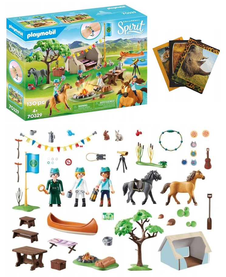 Wakacyjny kemping 70329 z Lucky i jej przyjaciółmi. Podczas kempingu można zjeść ciasto, wyplatać bransolety przyjaźni, oglądać gwiazdy oraz uprawiać kajakarstwo i jazdę konną. A także piec kiełbaski - ognisko LED (wymagane 2 baterie AAA). W zestawie znajdują się trzy figurki, 2 konie, namiot, kajak, teleskop oraz pozostałe akcesoria wzbogacające zabawę. A także bransoletka dla dziewczynki oraz oznaczenia sprawności z różnych zadań do kolekcjonowania (pozostałe bransoletki znajdują się w zestawach: 70330 i 70331). Zestaw stanowi wspaniałe uzupełnienie serii, a tym samym daje możliwość tworzenia nowych wątków podczas zabawy.