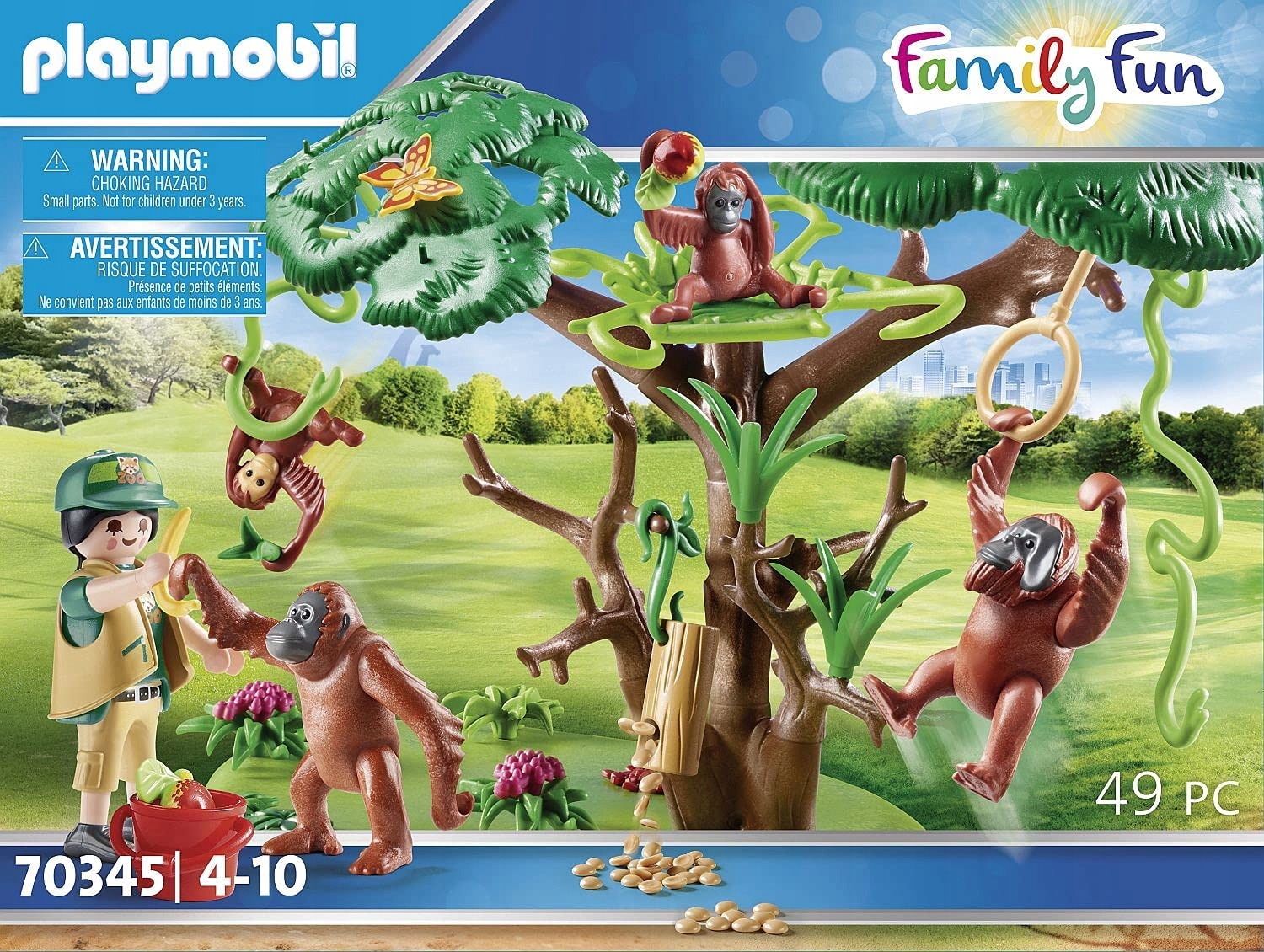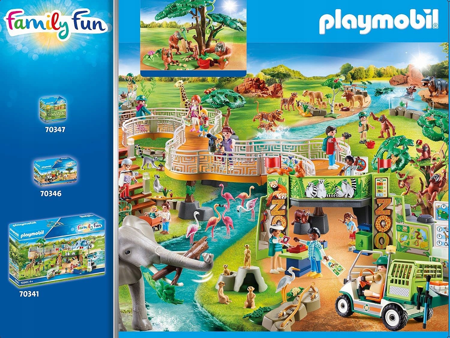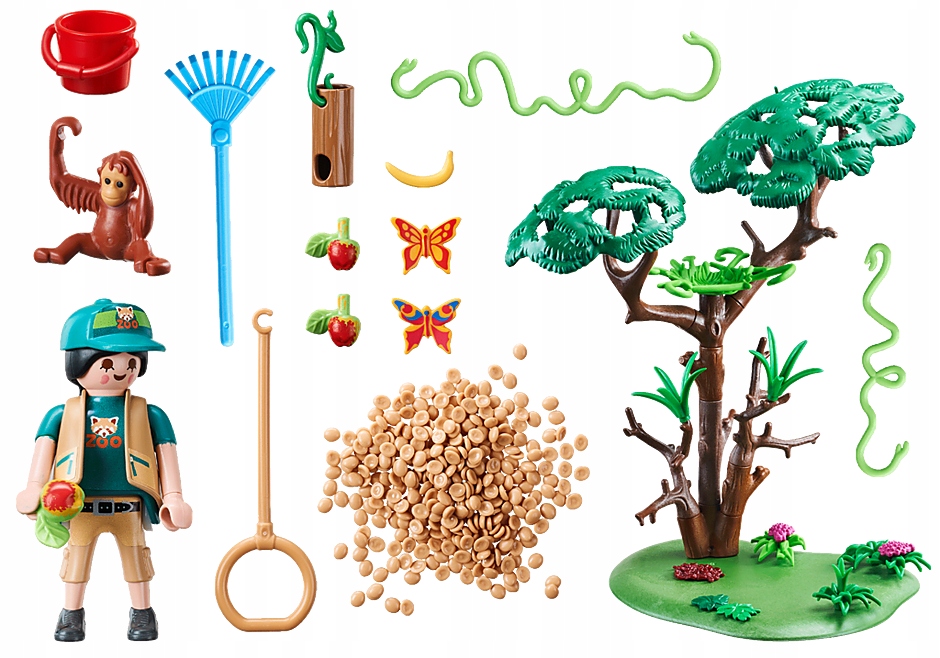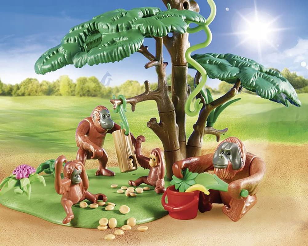 Niezwykle szczegółowe i realistycznie wyglądające detale inspirują dzieci do budowania własnego „mini świata', w którym odgrywają scenki i wchodzą w role poszczególnych postaci. Zwiedzający z wielkim entuzjazmem tłoczą się przed wybiegiem dla orangutanów. To zadziwiające, z jaką szybkością i zwinnością wielkie naczelne kołyszą się nad gałęziami i lianami. Samiec dostaje smakołyk z drewnianej rurki, podczas gdy samica radośnie zwisa z huśtawki. Zookeeper właśnie przychodzi ze świeżymi owocami. Niemowlęta orangutanów natychmiast podbiegają do nich i błyskawicznie kradną dwa banany z wiadra. Zestaw do zabawy składa się z dozorcy PLAYMOBIL, pary orangutanów i dwojga dzieci, drzewa z lianą i huśtawką, drewnianej tuby wypełnionej jedzeniem, dwóch bananów, dwóch jabłek, grabie i wielu innych dodatków.