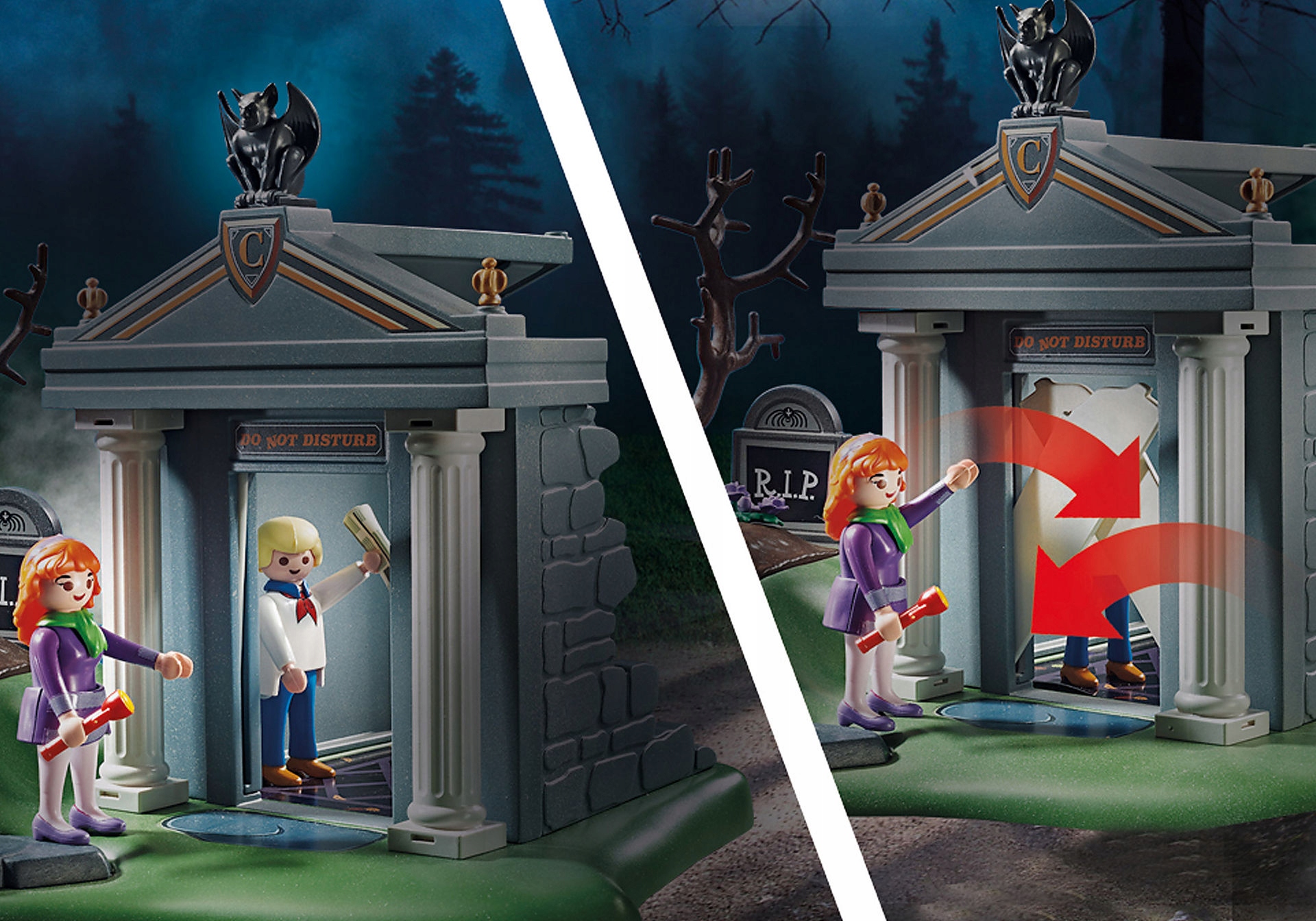 Gdy przyjaciele badają grób, niesamowity szkielet nagle wyskakuje z ziemi (wystarczy nacisnąć świecę obok grobu, aby go uruchomić). Szkielet świeci również w ciemności, zapewniając jeszcze bardziej przerażającą zabawę! Ponadto tajemnicza trumna, w której nagle znikają postacie, daje im kilka zagadek! Rzygacz nad wejściem do krypty służy jako tajna dźwignia do uwalniania kamiennych płyt nad drzwiami wejściowymi, które uniemożliwiają nieproszonym gościom wejście lub powstrzymanie ludzi przed ucieczką.
