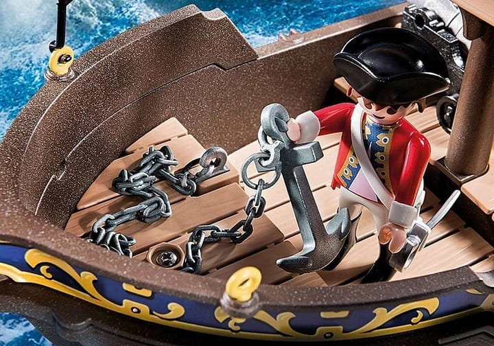 Statek z dwoma oficerami marynarki. Wyposażony w armatę, skrzynię skarbów i kotwicę. Statek pływa i może być wyposażony w silniczek podwodny (art. 7350 - do zakupienia oddzielnie).