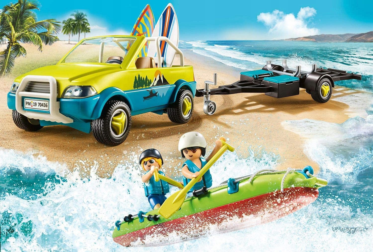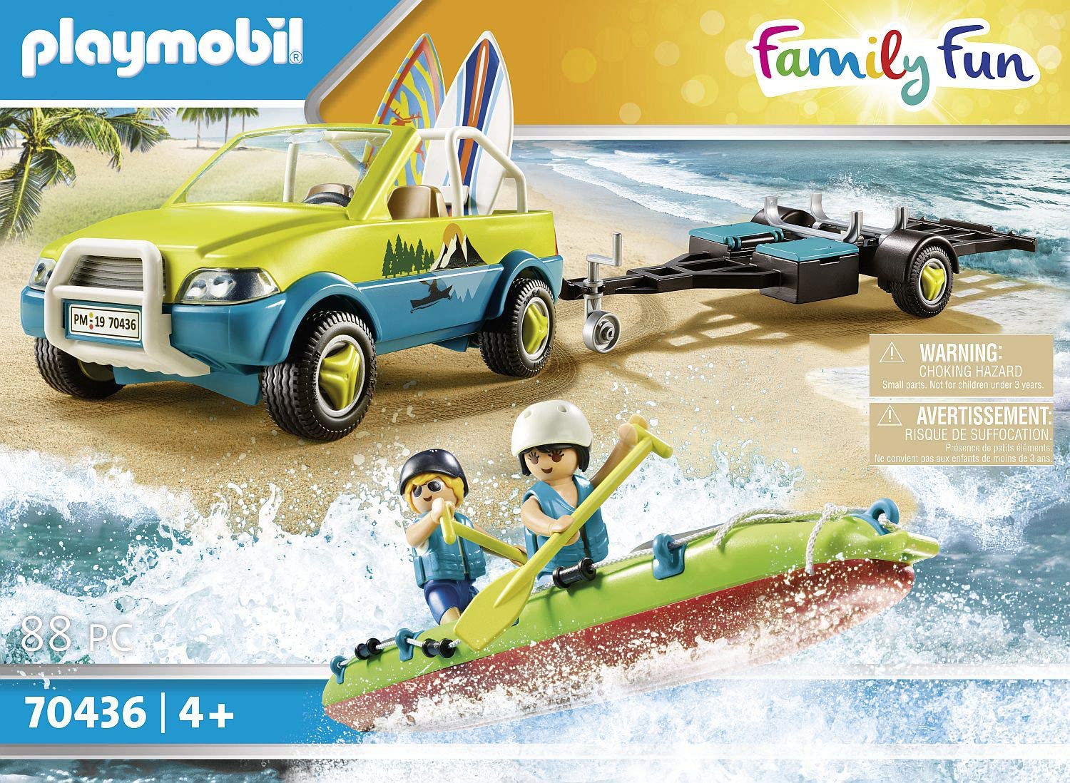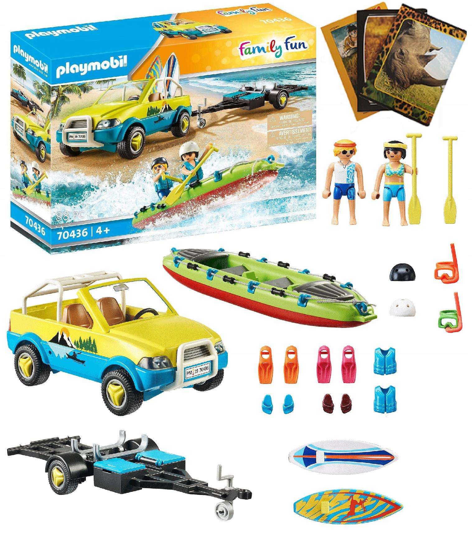 Czas wakacji to czas sportu. Dziś dwójka wybiera się na spływ kajakowy. Łódź do pływania po białej wodzie jest bezpiecznie przechowywana na przyczepie kajakowej, a na tylnym siedzeniu jest wystarczająco dużo miejsca na deski surfingowe, kamizelki ratunkowe i inny sprzęt sportowy. W miejscu docelowym zakłada się kamizelki ratunkowe i kaski i rozpoczyna się podróż. Nawet po dłuższej wyprawie kajakowej fani sportu wciąż nie są zmęczeni, z entuzjazmem wsiadają na deski surfingowe i rzucają się w fale. Idealny dzień sportu! W zestawie znajdują się dwie figurki PLAYMOBIL, pojazd terenowy z ochroną przed taranami i przyczepką do kajaków, łódka do pływania po wodzie, kamizelki ratunkowe, kaski, dwie deski surfingowe i wiele innych dodatków. Samochód nie jest kompatybilny z RC.