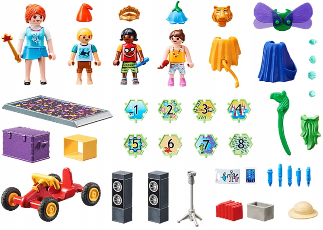 Wszystkie małe dzieci mogą szaleć, bawić się i tańczyć w wesołym Kids Clubie. Tutaj dzieci mogą jeździć gokartem do syta, malować, czytać i bawić się. Dzieci mogą rozwijać swoje muzyczne talenty na scenie. Szczególnie popularne są przebieranki, dla których dostępna jest przebieralnia z wieloma śmiesznymi kostiumami. W Kids Clubie dzieci czują się całkowicie komfortowo. W zestawie figurka PLAYMOBIL i trzy figurki dziecięce PLAYMOBIL, scena z mikrofonem i głośnikami podłogowymi, kuferek z różnymi kostiumami, gokart, materiały do malowania, książki i wiele innych akcesoriów. Elementy puzzli w podskakującej grze można zestawiać indywidualnie.