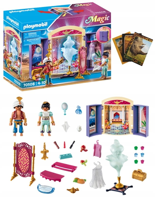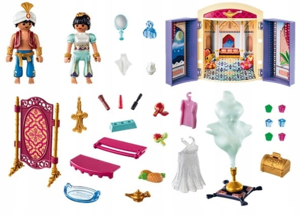 Podczas wędrówki po pałacu książę i księżniczka odkryli tajemniczą magiczną lampę. Gdy ocierają się o nią, pojawia się cudowny duch. Czy spełni ich dwójkę trzy życzenia? Playboxy PLAYMOBIL zapewniają świetną zabawę w podróży.
