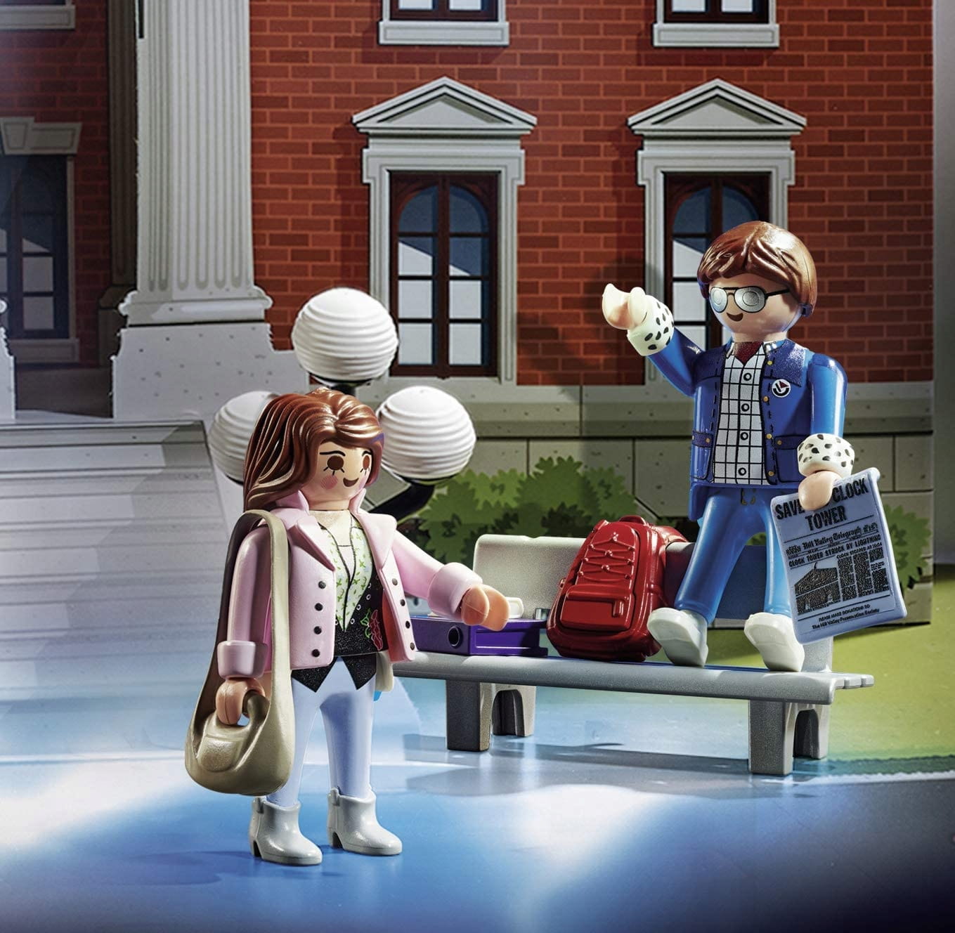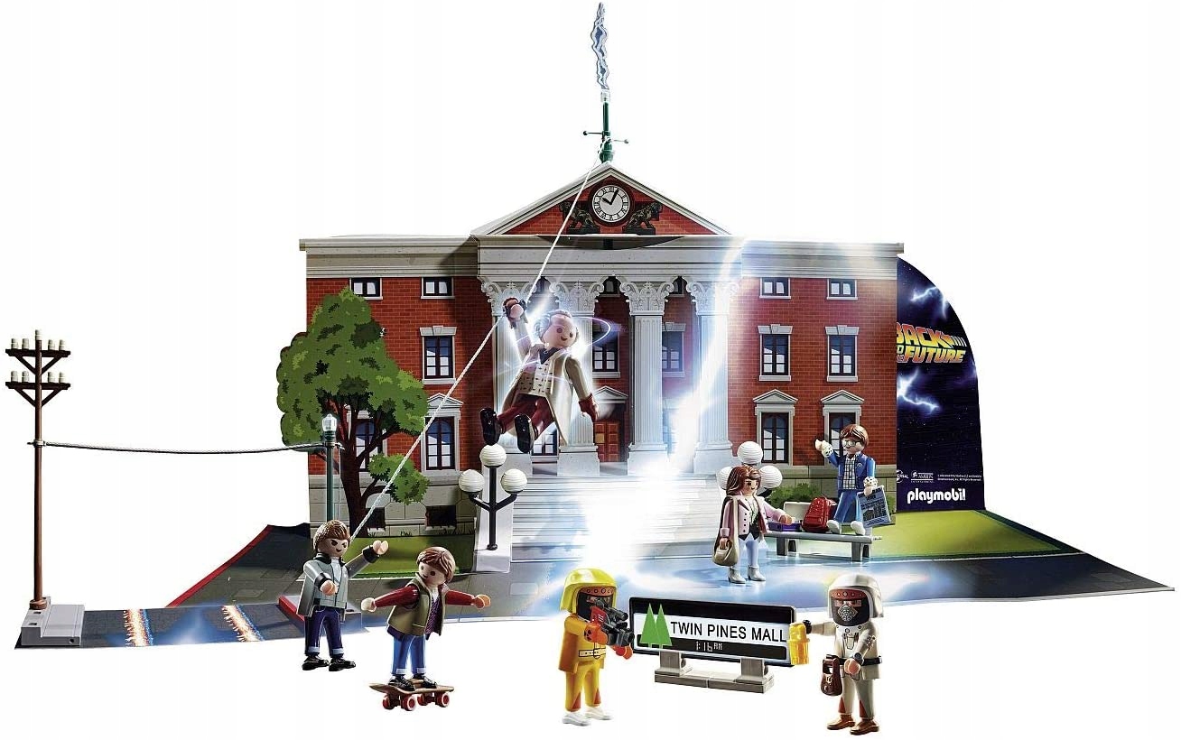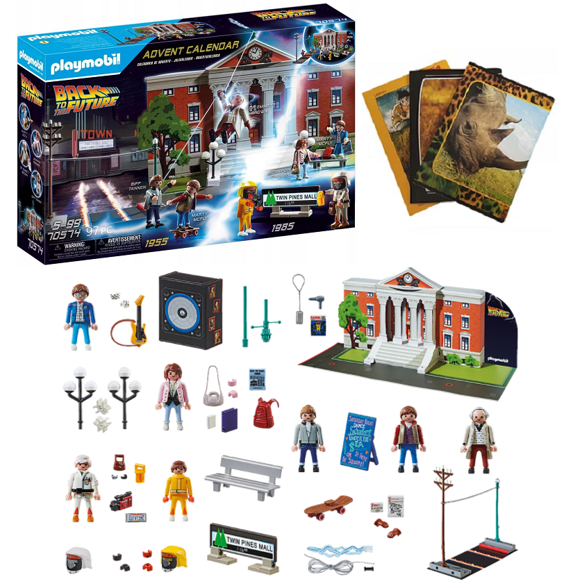 Kiedy już wszystkie niespodzianki zostaną odkryte, opakowanie można użyć do odgrywania legendarnych scen na miejskim rynku z filmów Powrót do przyszłości i Powrót do przyszłości II! Na przykład z Martym McFly´em i Jennifer Parker lub Doc Brownem i Martym na parkingu supermarketu Twin Pines Mall z roku 1985. Fani, którzy chcą się przenieść w jeszcze wcześniejsze lata 50-te, mogą odegrać scenę, w której Marty ucieka na deskorolce przed Biffem. Jest już prawie godzina 10:04 i Doc Brown musi jak najszybciej wejść na wieżę zegarową, aby przekierować piorun na kompensator! W każdym kalendarzu znajduje się bonus dla prawdziwych fanów: Trójwymiarowa kartka pocztowa, na której jak za dotknięciem czarodziejskiej różdżki znika cała rodzina McFly.