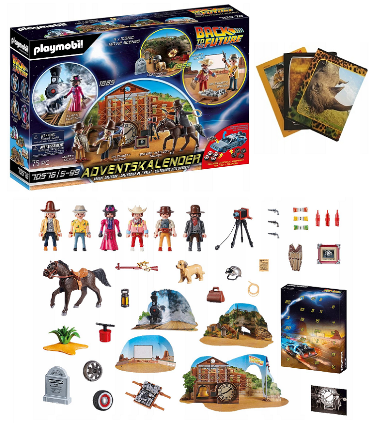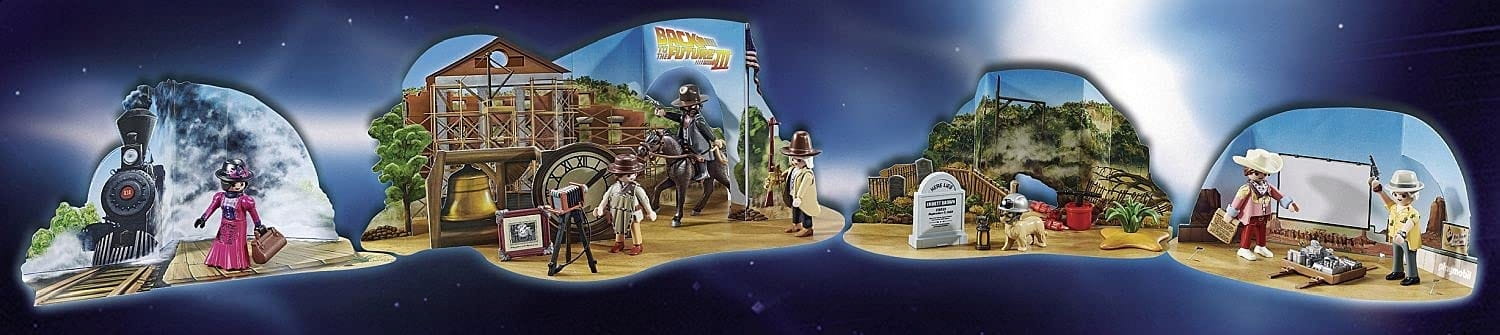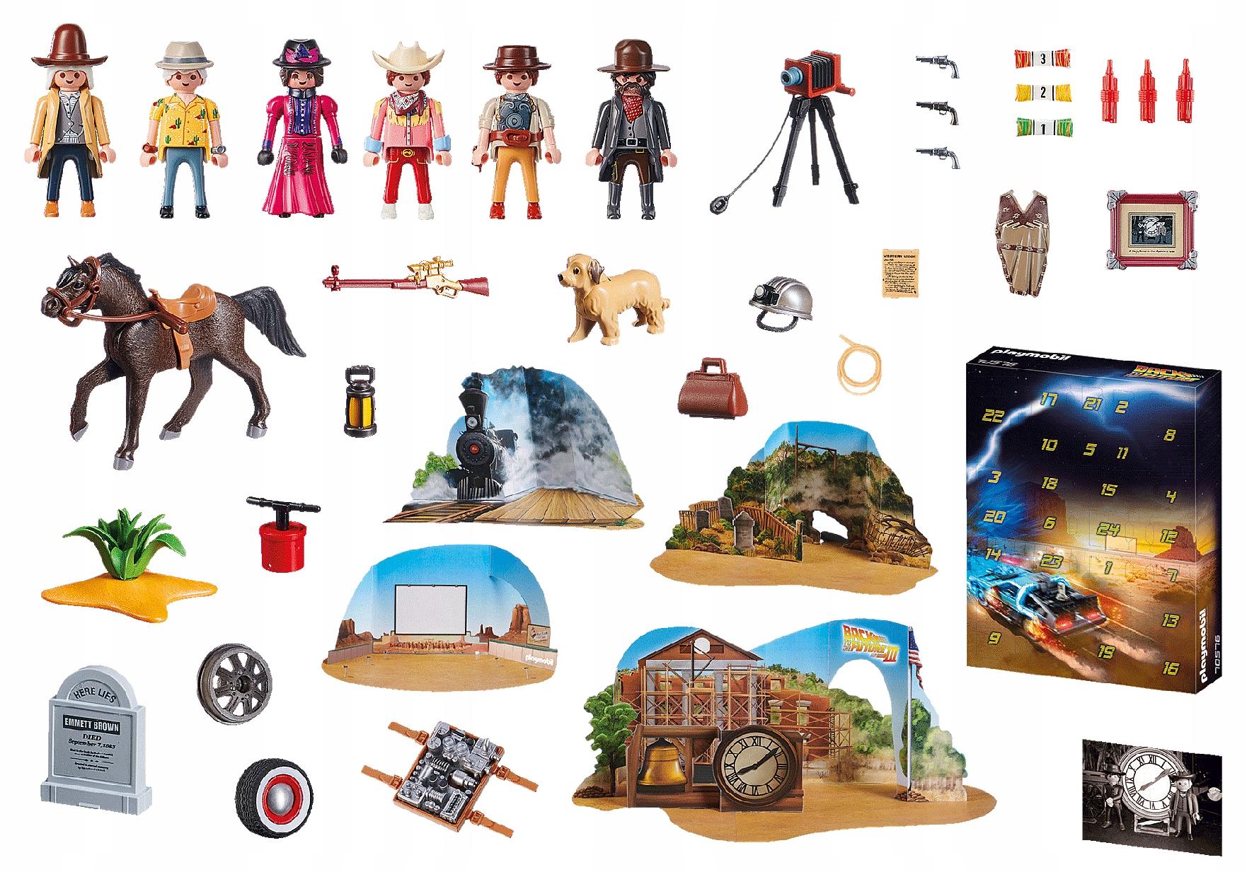 Dzięki zupełnie nowemu kalendarzowi adwentowemu „Powrót do przyszłości III” entuzjaści kina mogą wspominać i odtwarzać legendarne sceny z kultowego serialu filmowego. Tym razem przyjaciele Marty McFly i dr Emmett Brown zostają przeniesieni w przeszłość, do roku 1885, gdzie muszą zmierzyć się nie tylko z surowymi obyczajami Dzikiego Zachodu, ale także z zawadiackim Bufordem Tannenem. Oczywiście w tej przygodzie nie może zabraknąć miejscowej nauczycielki, a później dziewczyny Doktora, Clary Clayton i teriera Kopernika. Jako specjalny dodatek, ten niekonwencjonalny kalendarz adwentowy zawiera ekskluzywną dioramę przedstawiającą różne lokacje filmowe oraz fajną kolekcjonerską pocztówkę. Ponadto DeLorean (70317 - sprzedawany osobno) można przekształcić za pomocą dołączonych akcesoriów do różnych podróży w czasie. Z nostalgicznym stylem i kultowymi detalami, ten kalendarz adwentowy przynosi nie tylko fanom PLAYMOBIL pełną energię Powrót do przyszłości. Dziki Zachód czeka!