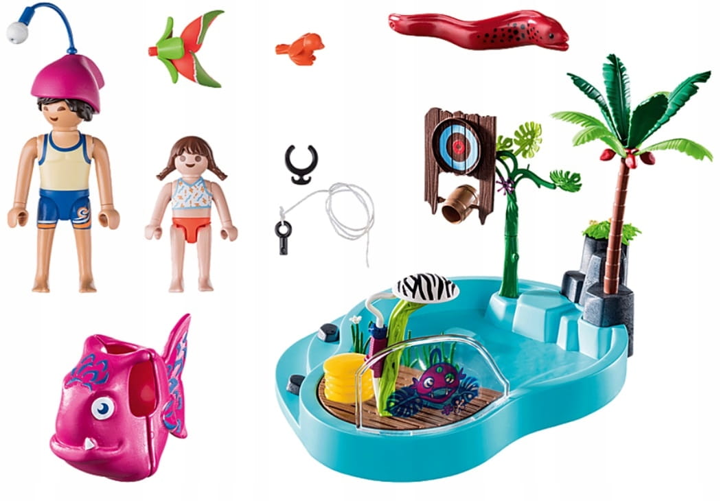 W basenie zawsze jest fajnie. Tutaj młodzi i starzy kąpiący się mogą pluskać się, pluskać i bawić się do syta. Strzelanie z dużego pistoletu do wody to świetna zabawa. Po kilku wstępnych sesjach treningowych na dużym dysku wszystko idzie naprawdę dobrze i wiadro jest pełne w mgnieniu oka. Kiedy się przewraca, tata bierze silny prysznic. Zabawny kostium ryby, który ma na sobie, robi się całkiem mokry. Zestaw do zabawy zawiera dwie figurki PLAYMOBIL, mężczyznę i dziecko w strojach kąpielowych, miskę na wodę z pompką i pistoletem natryskowym, kostium ryby, mureny i wiele innych dodatków do zabaw w wodzie. Umywalkę można napełnić wodą.