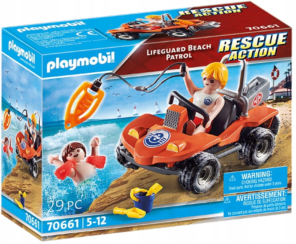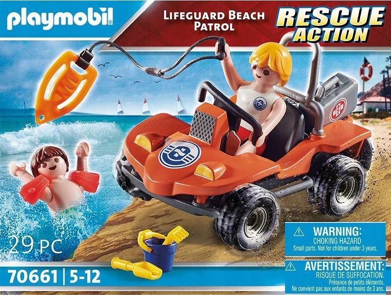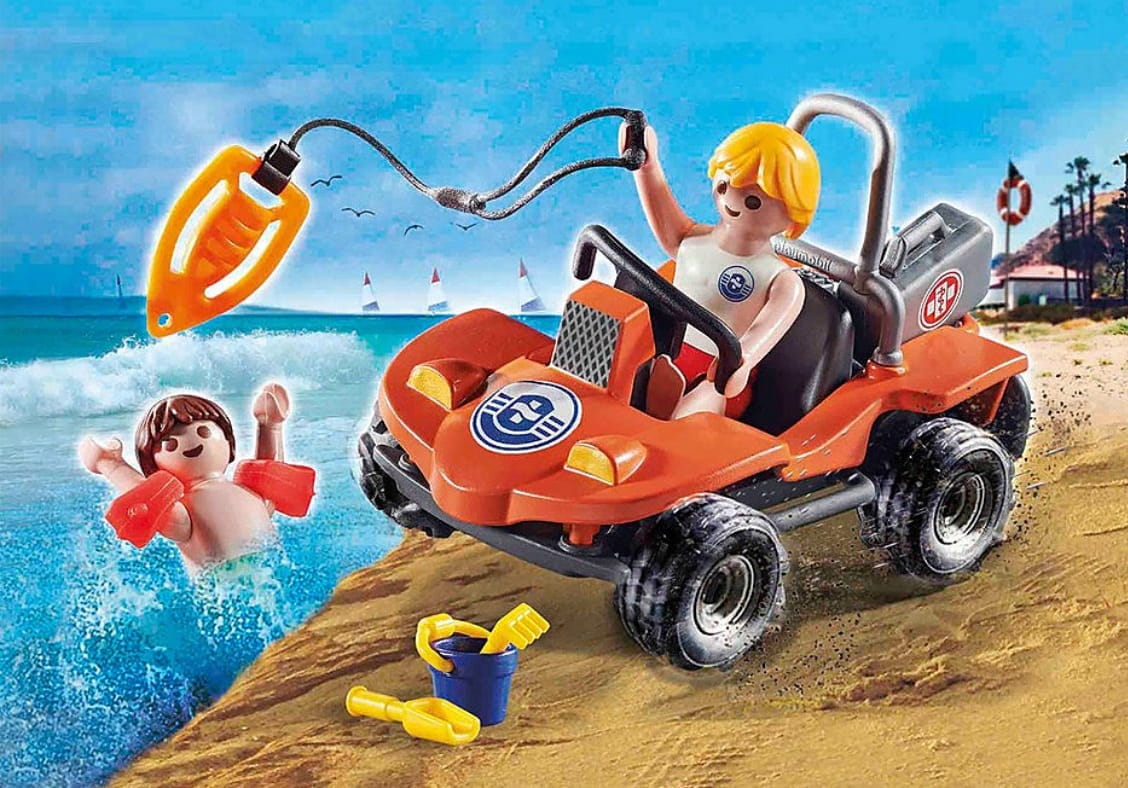 Zawsze gotowy do obrony ratownik bacznie obserwuje brzeg i wodę. Kiedy potrzebna jest jego pomoc, wskakuje swoim plażowym quadem i rusza na ratunek, rzucając swoją rurkę ratunkową pływakowi. Zestaw zawiera ratownika, figurkę dziecka, quada, apteczkę, wiaderko z piaskiem i inne akcesoria.