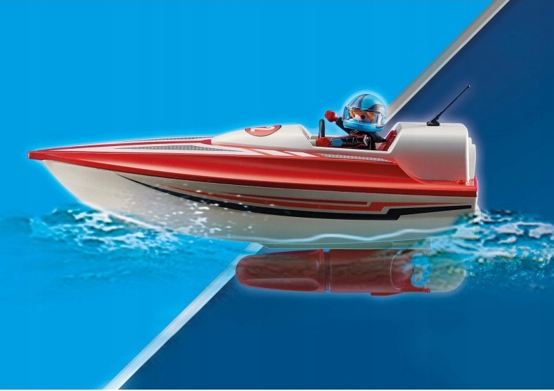 Za pomocą zestawu możesz wziąć udział w szalonych wyścigu! Pomoże Ci wygrać wyścig zawodowy sportowiec który właśnie zakłada kask i wskakuje do łodzi motorowej. Mały chłopczyk jest jego wiernym fanem. Jest na wszystkich zawodach, nie może przegapić żadnego wyścigu. W kolejce czeka drugi sportowiec. Kto dziś wygra? Zamontuj silnik podwodny i sam zdecyduj!
