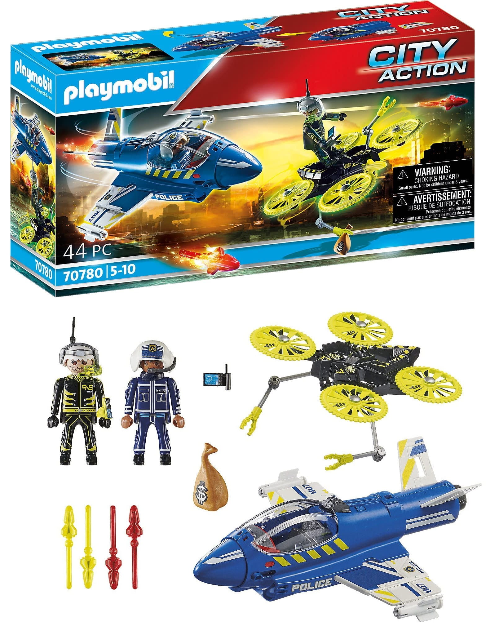 Zestaw zawiera dwie figurki PLAYMOBIL, rozkładany odrzutowiec policyjny z działami, z których można strzelać, dron z ruchomymi śmigłami wirnika i wieżyczką, hełmy, komputer na ramieniu i wiele innych dodatków.