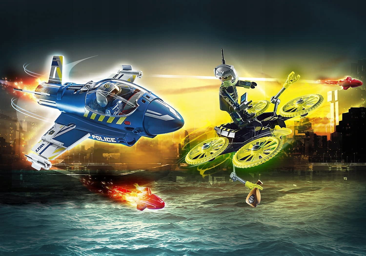 Sprytny złoczyńca zbudował sobie super drona i sprawia, że miasto jest niebezpieczne. Ale sprawca nie spodziewał się policji PLAYMOBIL i ich fajnego odrzutowca. W mgnieniu oka pilot wskakuje do kokpitu i rozkłada nos, kadłub i skrzydła samolotu. Pociski są przyczepione do spodu skrzydeł i wylatują w powietrze. Ale co to jest? Odrzutowiec ledwo oderwał się od ziemi, gdy pocisk mija kokpit o włos. Pilot może wykonać unik w ostatniej chwili. Ale potem oszust znów się zbliża i ostre zęby piły na łopatach wirnika drona mijają strumień tylko o kilka centymetrów. Rozpoczyna się ekscytująca pogoń w powietrzu.