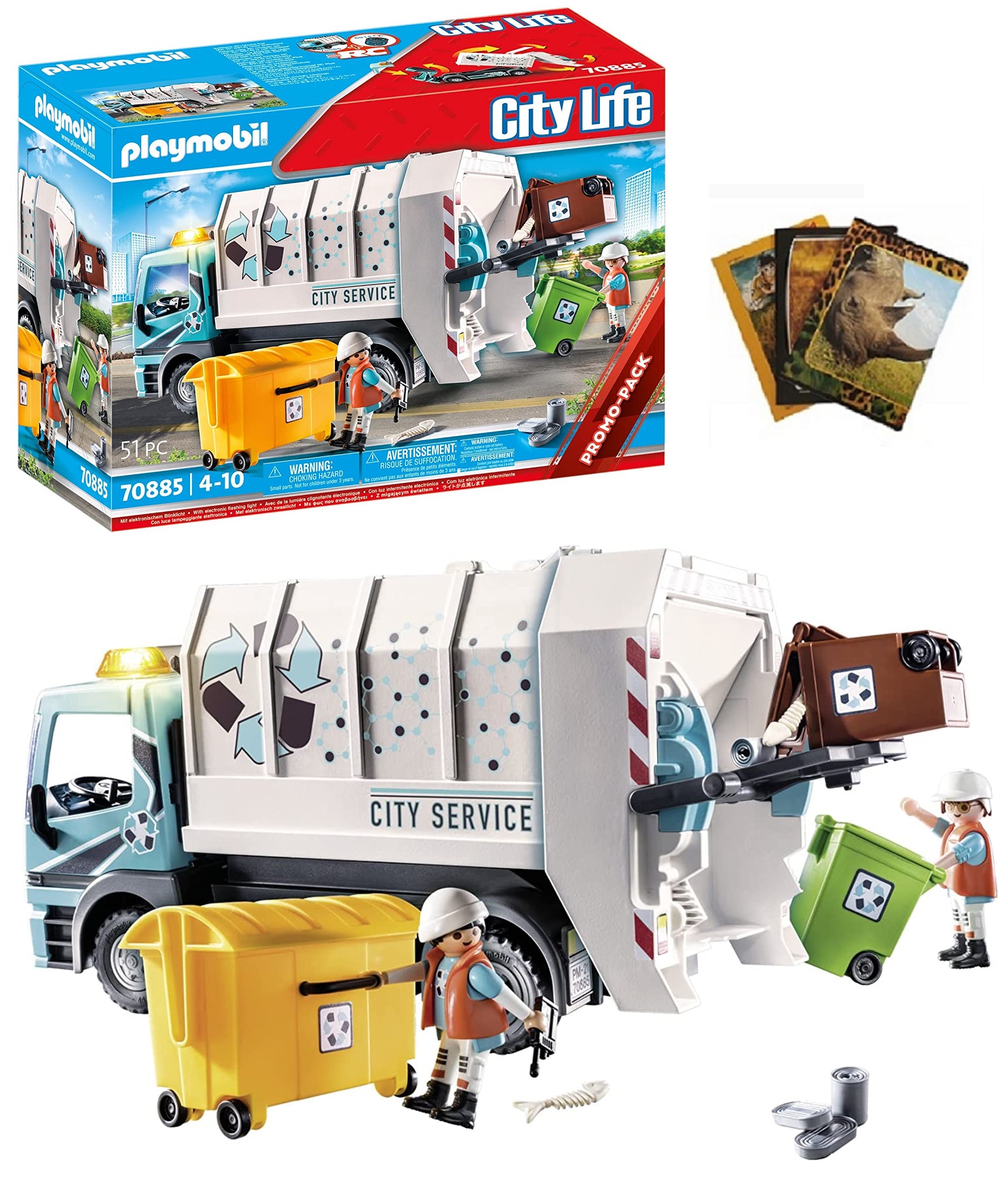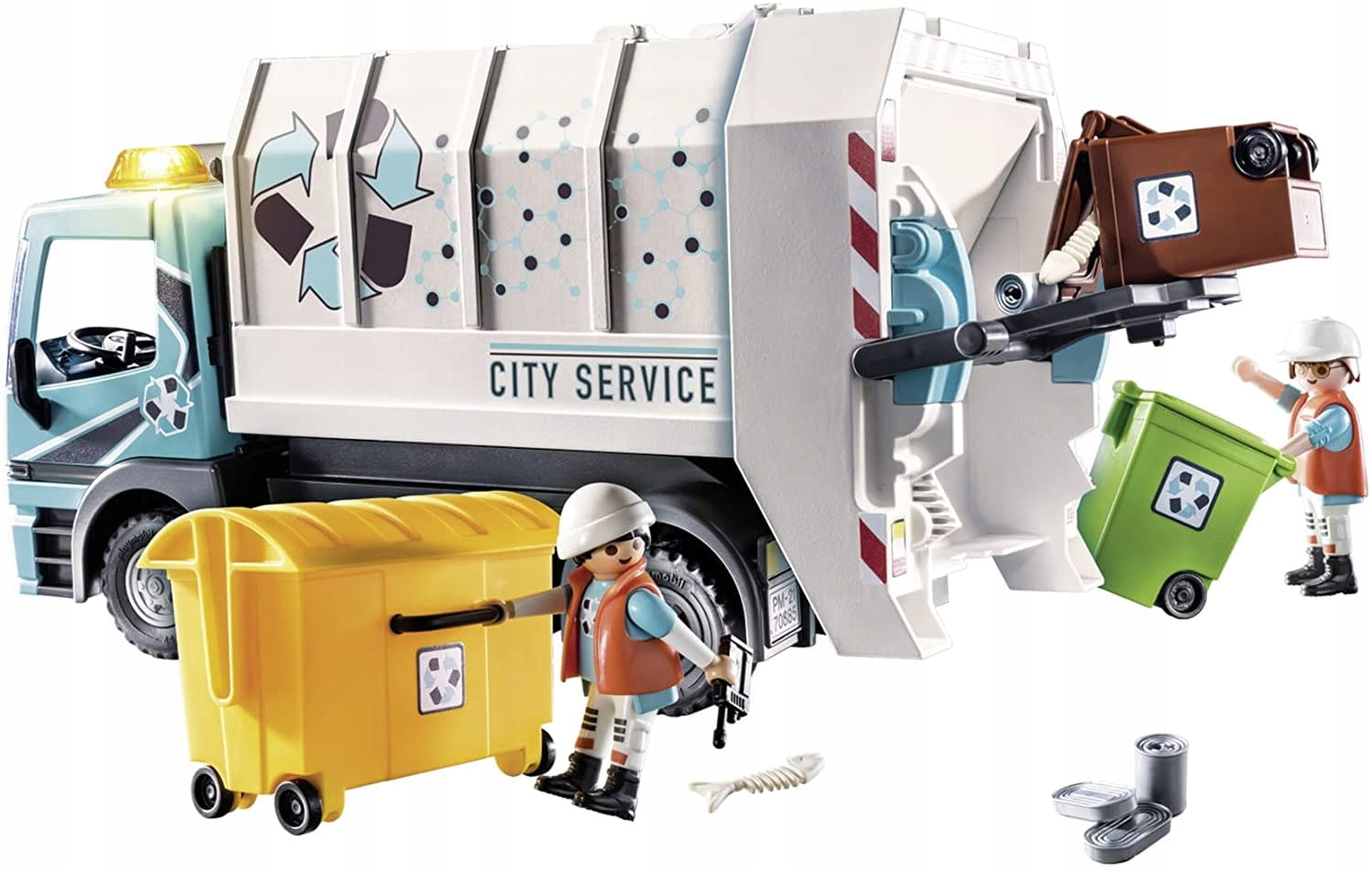 Wszystkie pojemniki na śmieci i pojemniki w obszarze mieszkalnym muszą zostać opróżnione. Kierowca z dużą śmieciarką ostrożnie podjeżdża do kontenerów, jego kolega zaciska pełny kosz w uchwycie i otwiera pokrywę. Teraz dźwignia jest uruchomiona i idzie w górę. Śmieci z huśtawką wpadają do auta, po czym śmietnik znów zostaje postawiony na ulicy. Pod koniec dnia trafia na wysypisko śmieci. Zestaw zawiera dwie figurki PLAYMOBIL, śmieciarkę z migającym światłem i zdejmowanym dachem, dwa kubły na śmieci, pojemnik na śmieci i inne dodatki. Aby opróżnić śmieciarkę, tylną część zwalnia się i składa się osprzęt pojazdu.