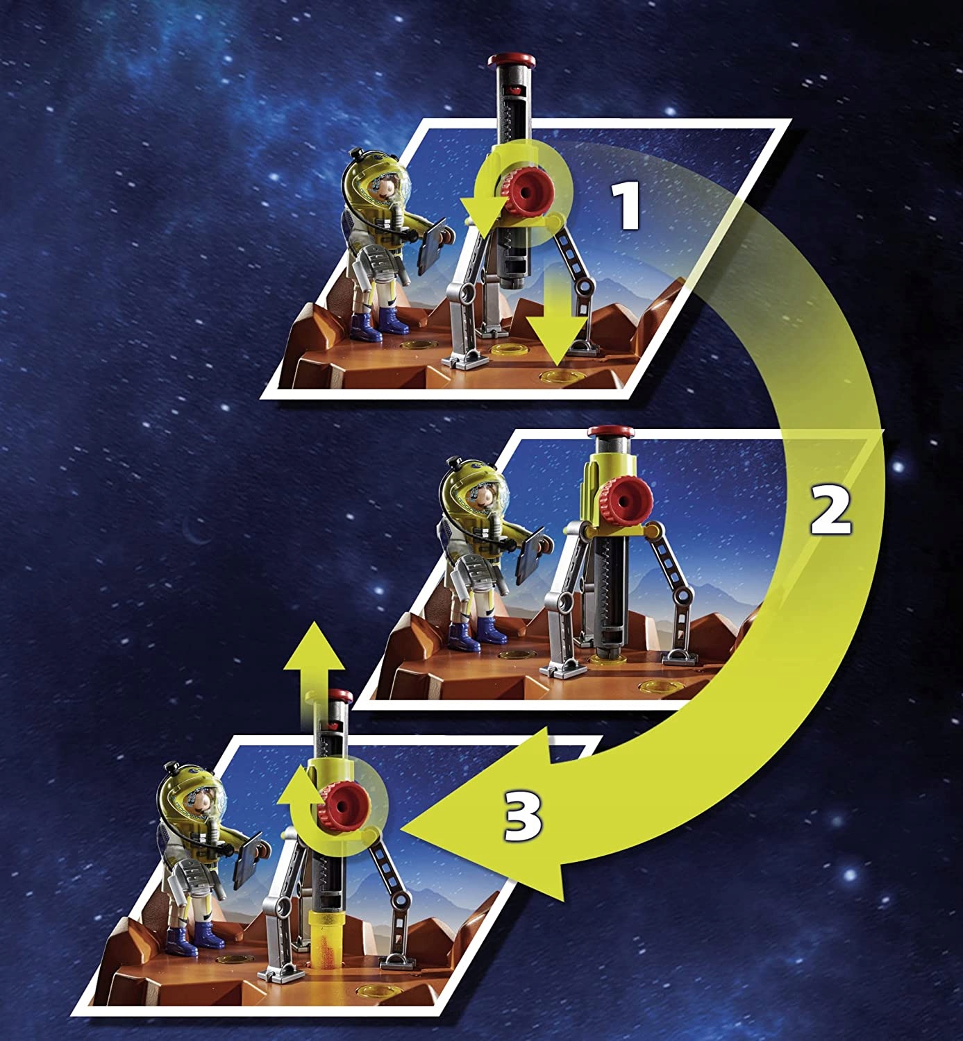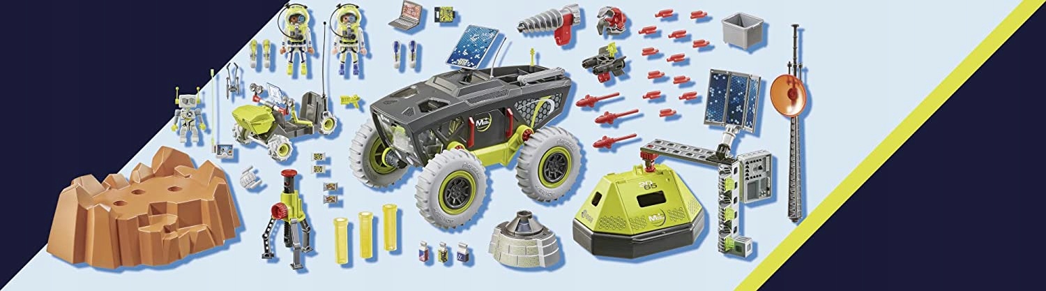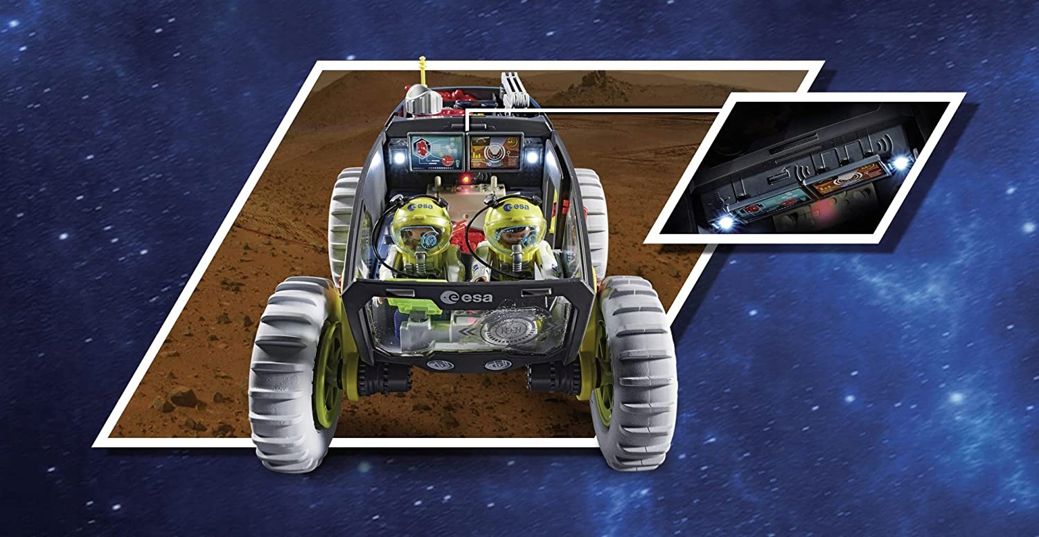 Ruszaj na różnorodne kosmiczne przygody z PLAYMOBIL Mars Expedition. W łaziku marsjańskim za pomocą światła i dźwięku możesz eksplorować czerwoną planetę. Wiertarka służy do poszukiwania minerałów w skale. Jeśli astronauci odkryją coś interesującego, zamień nasadkę wiertła na ramię chwytaka i ostrożnie podnieś przedmiot. W stacji badawczej wszystkie próbki są szczegółowo badane. Aby pokonywać krótsze odległości, astronauci używają zwinnego marsjańskiego trójkołowca. Próbki skał można schować w skrzyni ładunkowej z przodu wózka. Jakie spostrzeżenia uzyskają astronauci podczas tej ekspedycji? Zestaw do zabawy zawiera dwóch astronautów PLAYMOBIL, łazik marsjański ze światłem i dźwiękiem, trójkołowiec marsjański, stację wiertniczą, laboratorium badawcze, robota i wiele innych dodatków do ekscytujących misji na Marsa. Karwasze i hełmy astronautów są zdejmowane. Wszystkie mechanizmy świetlne i dźwiękowe mają funkcję automatycznego wyłączania. Nazwa ESA i logo ESA są zastrzeżonymi znakami towarowymi Europejskiej Agencji Kosmicznej (ESA).