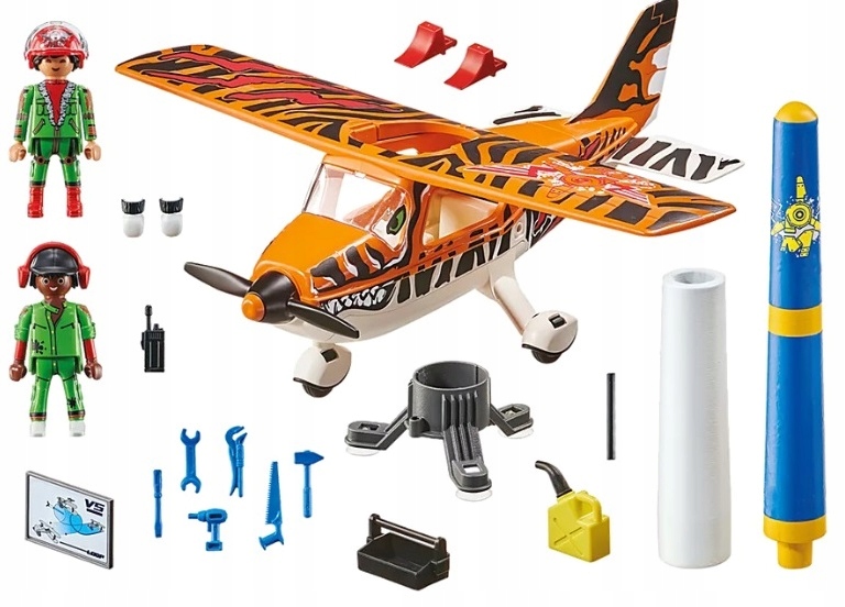 Zestaw zawiera dwie figurki PLAYMOBIL, samolot śmigłowy z ruchomym śmigłem, kanister na benzynę, dwa klocki hamulcowe, pylon, kask, rękawiczki i wiele innych dodatków do ekscytujących przygód lotniczych. Dzięki trzem przyssawkom na podstawie, duży pylon można bez problemu ustawić również na gładkich powierzchniach.