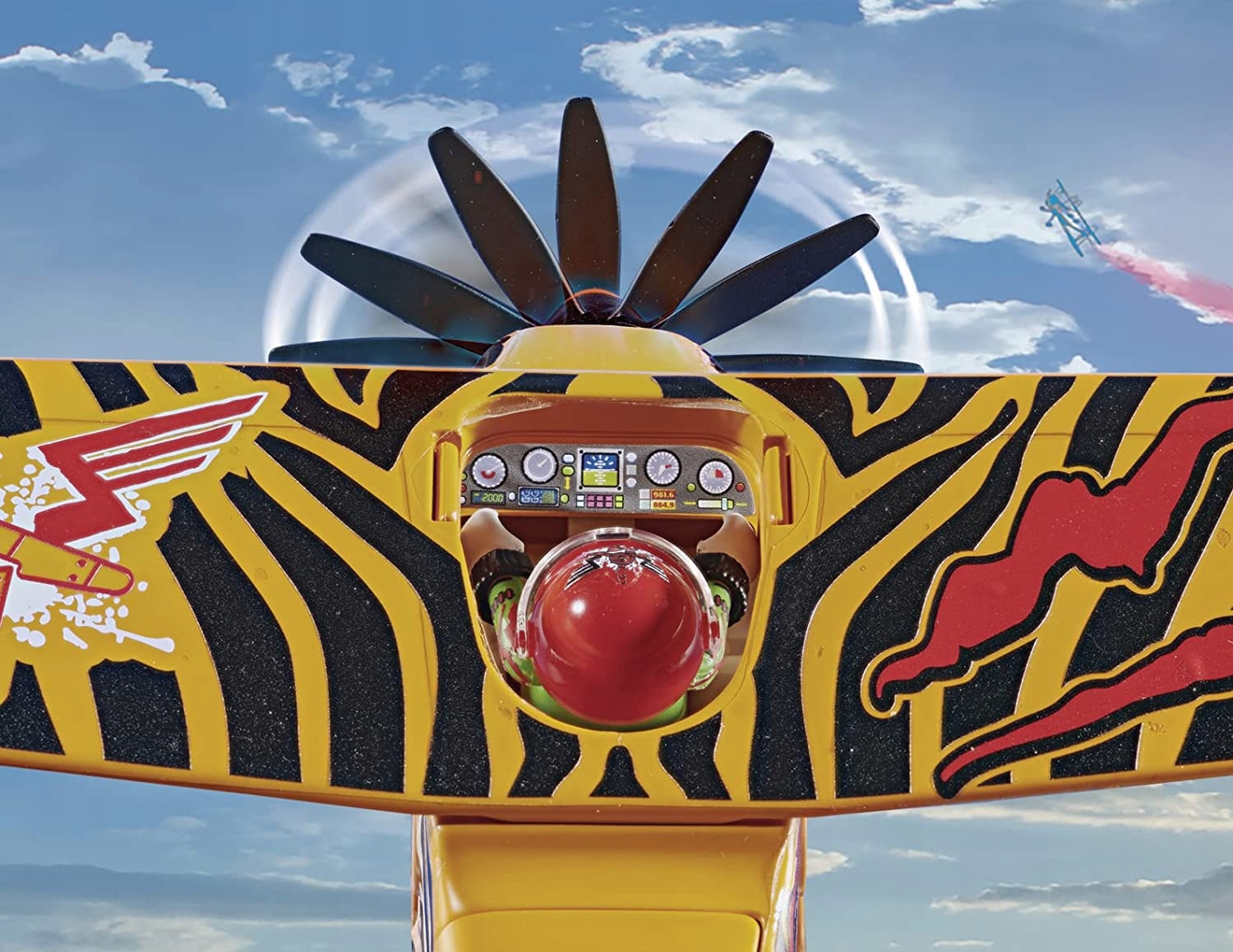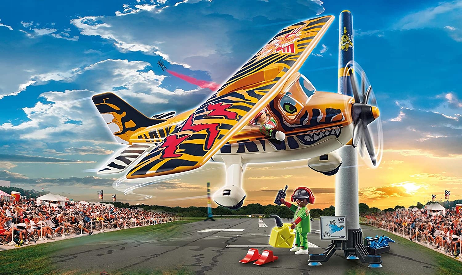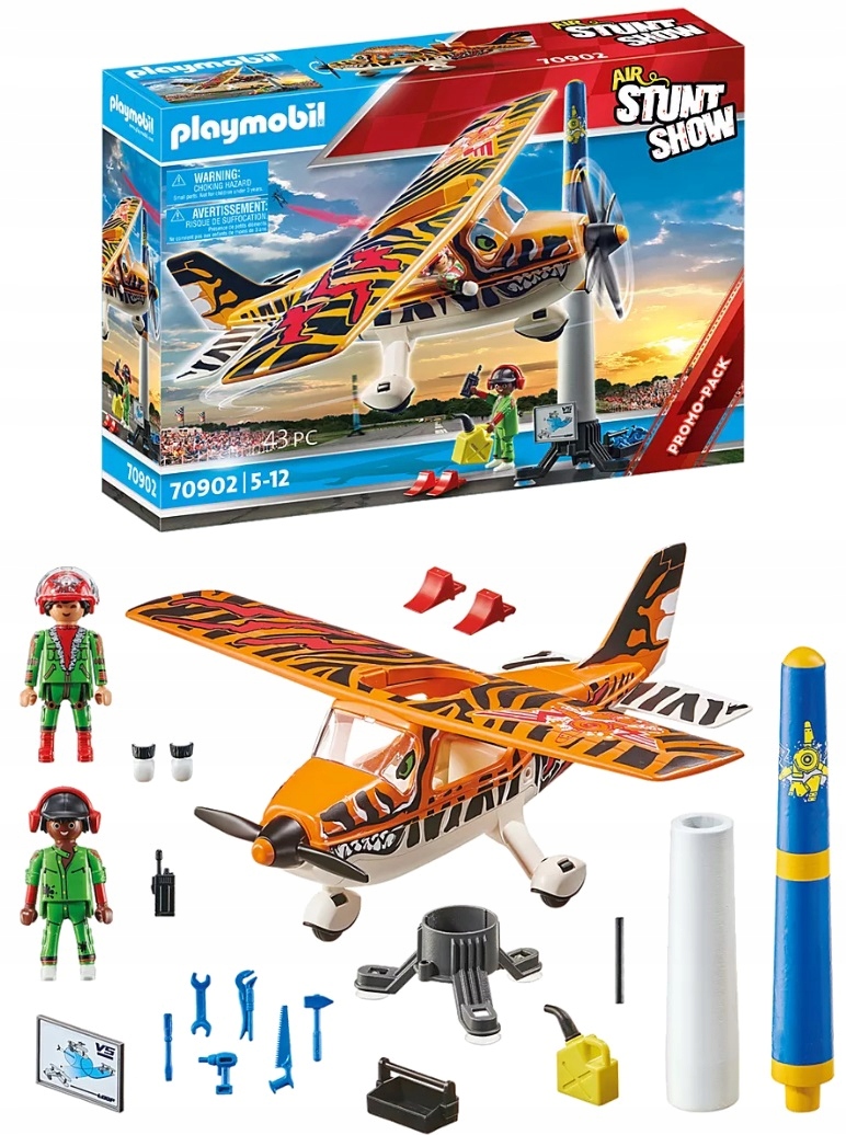 Samolot śmigłowy Air Stunt Show firmy PLAYMOBIL to śmiała akcja lotnicza. Z wielką precyzją pilot lata wokół wysokich pylonów ze swoim samolotem śmigłowym w chłodnym tygrysim liberii. Bez wysiłku wykonuje zapierające dech w piersiach manewry lotnicze na wysokich wysokościach. Z ziemi mechanik monitoruje pokaz i przygotowuje się do lądowania.