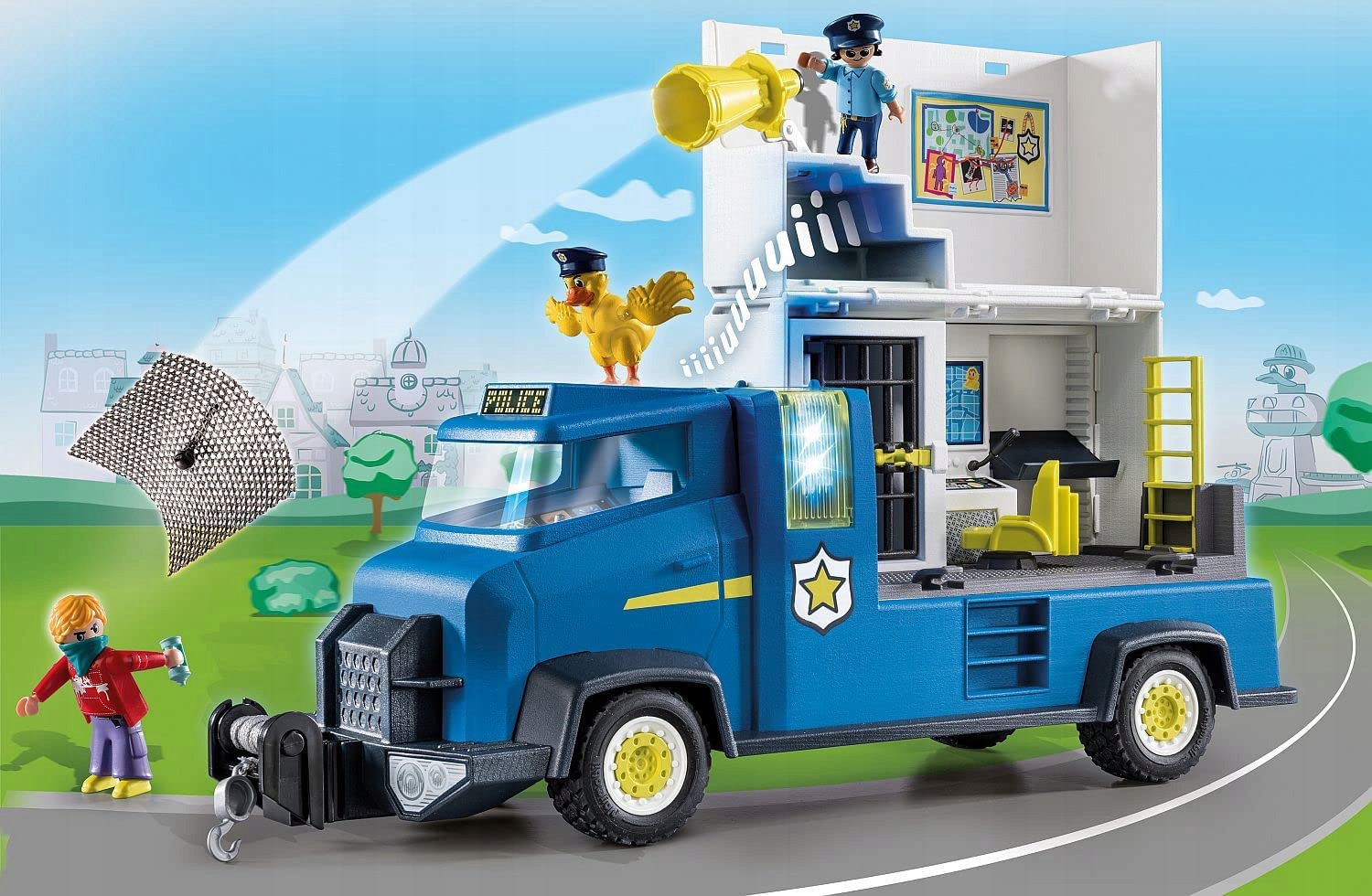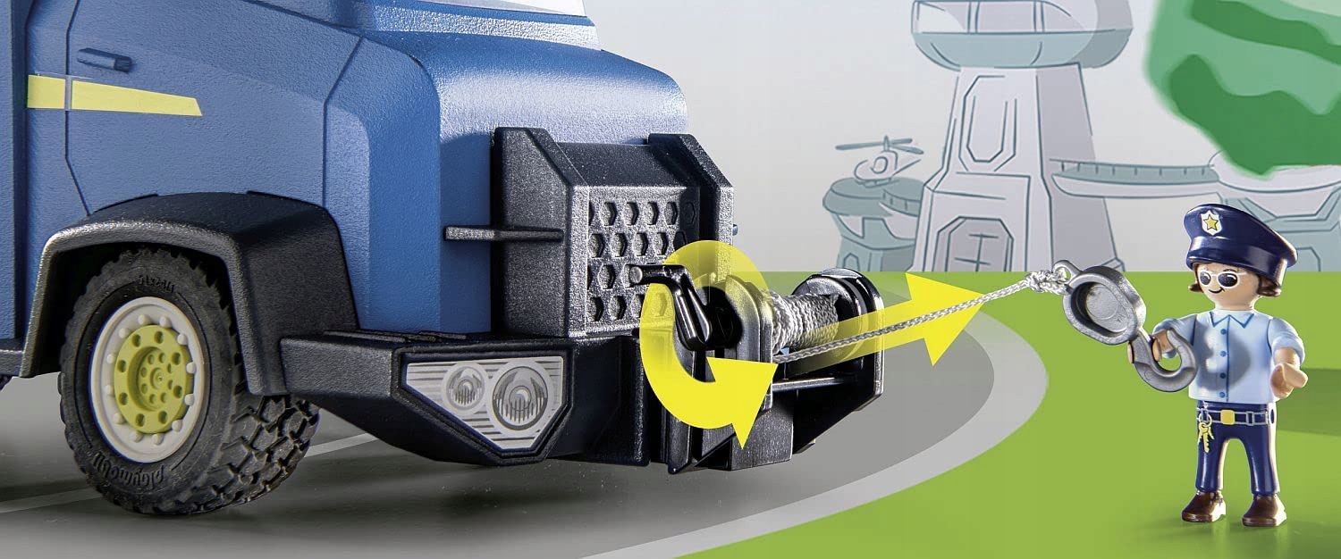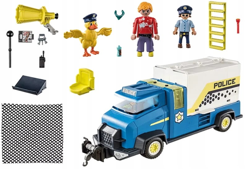 Na zestaw do zabawy składają się trzy figurki PLAYMOBIL, duża policyjna ciężarówka z celą więzienną (wraz z możliwością ucieczki), centrum monitoringu oraz działko sieciowe.