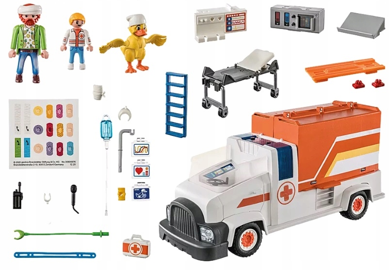 - Akcesoria: 1 wózek lekarza pogotowia ratunkowego z modułem światła i dźwięku oraz składany pojemnik z noszami ratunkowymi z mobilną podstawą i podświetlaną skrzynką na monitor, 1 drabina, 1 wkładka na sprzęt, 1 pochyła półka, 1 drzwi szafy, 1 apteczka, 3 x- rayboardy, 1 infuzja ze stojakiem i opaską na ramię, 2 węże, 1 mikrofon, 2 maski oddechowe, 1 bandaż na głowę, 1 bandaż na ramię, 1 szyna na bandaż, 1 arkusz plastra.