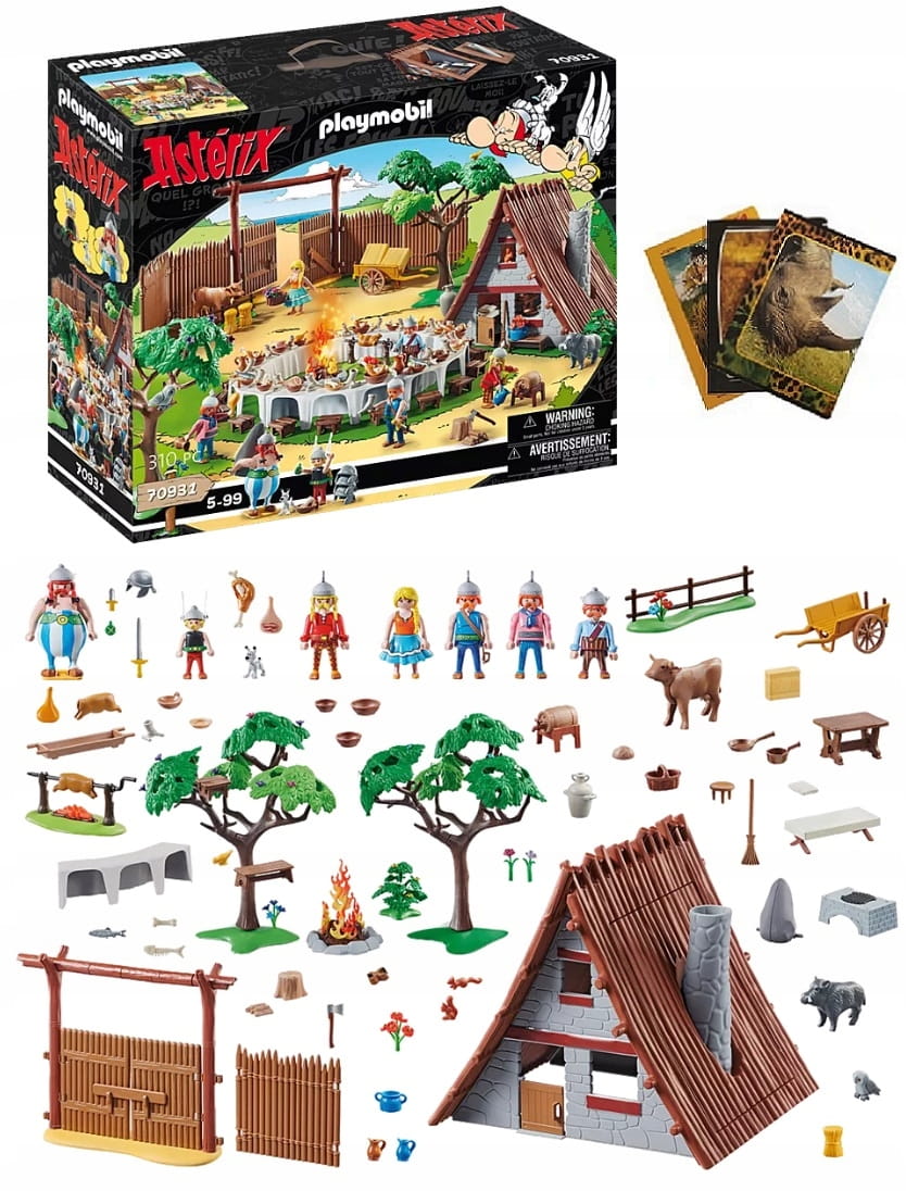 Bogato zastawiony przysmakami stół bankietowy oferuje miejsce dla 18 Galów. Na obrotowym rożnie przy ognisku grilluje się dzika. Chata Asterixa jest otwierana na dachu i wyposażona w wiele akcesoriów. Elementy palisady przywołują wiejski charakter. Zawiera Asterix, Obelix i Idefix, a także wiele innych popularnych postaci z komiksowej serii. Wymiary chaty Asterix: 25 x 24 x 23 cm (DxGxW) Wymiary bramy z palisadami: 70 x 9,5 x 21 cm (DxGxW) Wymiary stołu bankietowego: 30 x 30 x 4 cm (DxGxW).