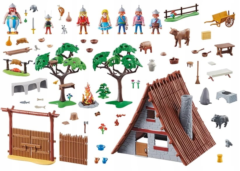 - Akcesoria: chata Asterixa, 4 palisady, 1 brama, 1 element ogrodzenia, 1 wóz , 6 stołów, 1 kominek, 1 kominek z rożnem, 1 menhir, 18 taboretów, 18 kubków do picia, 1 taboret, 1 łóżko, 1 poduszka, 1 drewniany stół, 1 miejsce do gotowania, 1 zestaw garnków, 1 miotła, 1 ławka, 3 hełmy rzymskie, 1 klocek do rąbania, 1 topór, 4 gliniane dzbanki, 1 nosze, 5 kłód, 1 garnek, 2 bele słomy, 2 związane słomą, 4 kości rybne, 7 kości, 6 szynka, 2 pieczeń z dzika, 1 chleb, 1 tawerna, 1 wazon, 5 mięs z kościami, 4 talerze z uchwytami, 4 talerze, 4 duże miski, 4 średnie miski, 4 małe miski, 1 stojak, 1 kosz, 2 bukiety kwiatów, 4 róże, 1 krzew kwiatowy, 2 drzewa, 1 hełm Asterix ze skrzydłami, 1 butelka do picia, 1 sztylet, 2 pasy, 2 hełmy z rogami,3 hełmy Galów, 2 pętle, 4 mankiety, 1 szlufka, 2 miecze.