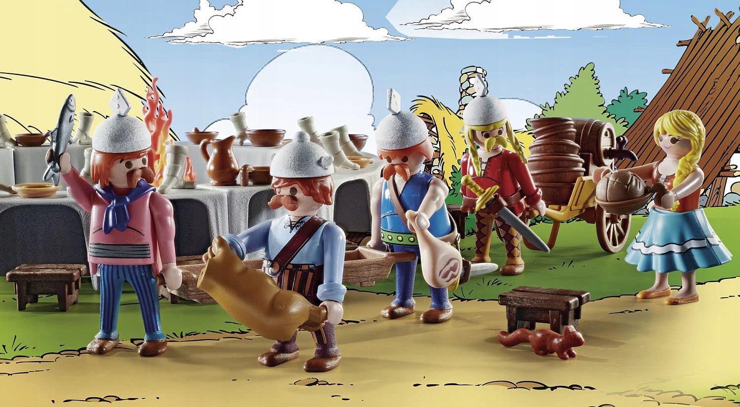 Cała Galia jest okupowana przez Rzymian... Cała Galia? Nie! Wioska zamieszkana przez nieposkromionych Galów PLAYMOBIL nie przestaje stawiać oporu najeźdźcy. Nierozłączne trio przyjaciół, Asterix, Obelix i Idefix, wspólnie przeżywają niezapomniane przygody, które często zabierają dzielnych Galów do odległych krain. Po każdej podróży wracają do spokojnej wioski i ucztują na uczcie, aby odzyskać siły po bójkach z Rzymianami. Wielki stół bankietowy jest już zastawiony, a nad ogniem na szpikulcu skwierczy przepyszny dzik. Zanim rozpocznie się uroczystość, Obelix szybko umieszcza swój menhir w schronisku Asterix Hütte i wkłada kilka kości do miski, aby przygotować IDefix. A potem nadszedł czas, aby dostać się do dzika!