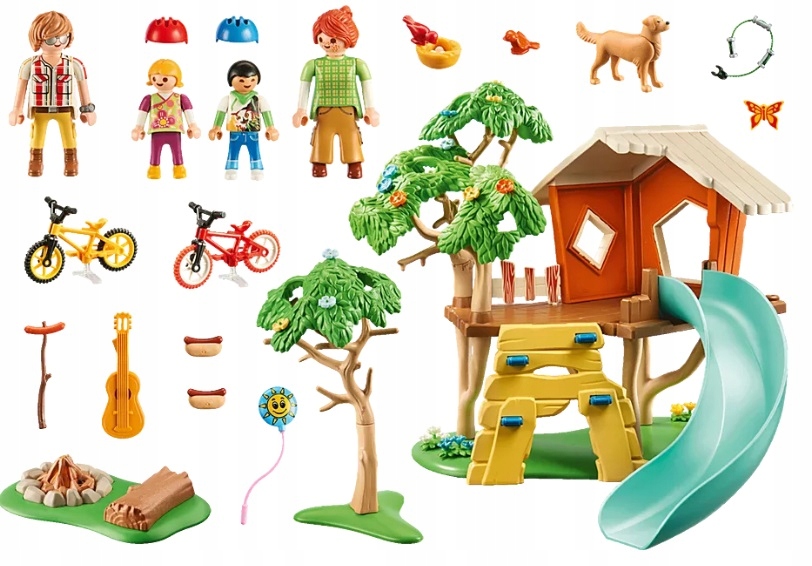 Zestaw zawiera dwie figurki PLAYMOBIL i dwie figurki dla dzieci, psa, domek na drzewie ze zjeżdżalnią, dwa rowery, ognisko, gitarę i wiele innych wspaniałych dodatków. Ognisko ze zintegrowaną funkcją oświetlenia zapewnia autentyczne wrażenie na świeżym powietrzu.