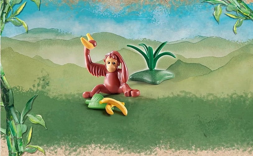 - Akcesoria: 1 roślina, 1 liść, 3 banany, 1 karta wiedzy „Młody orangutan”.