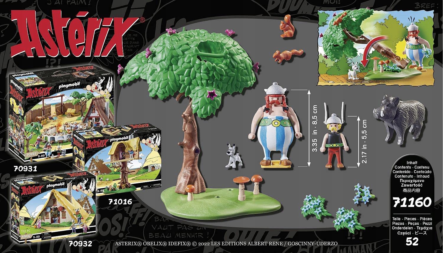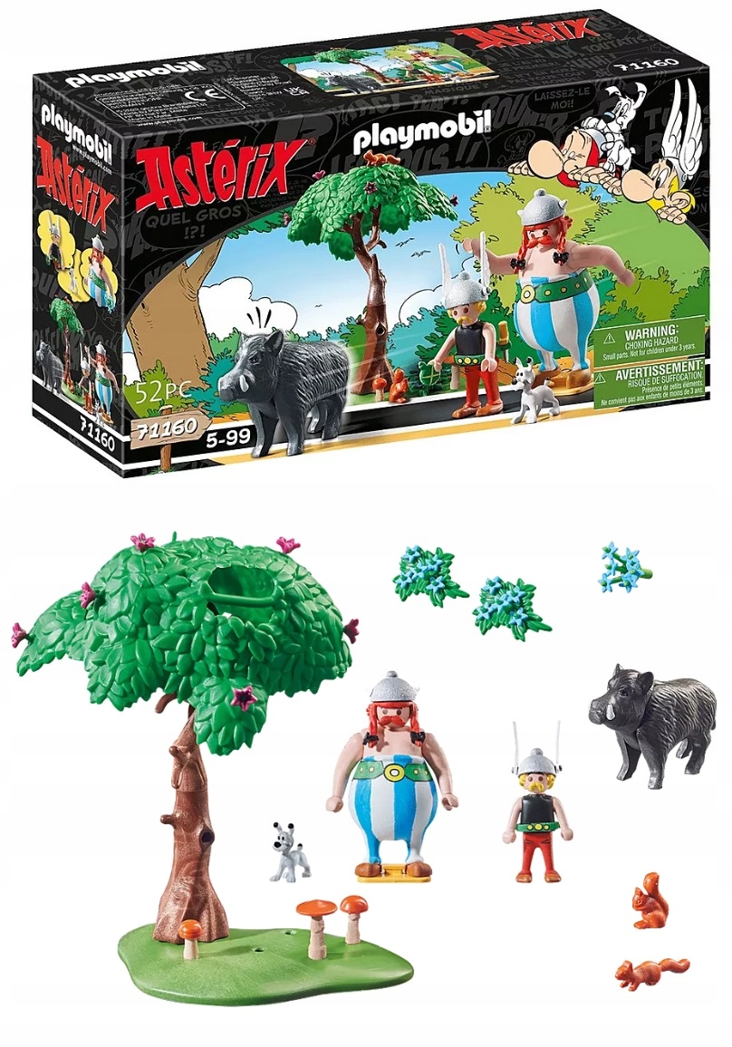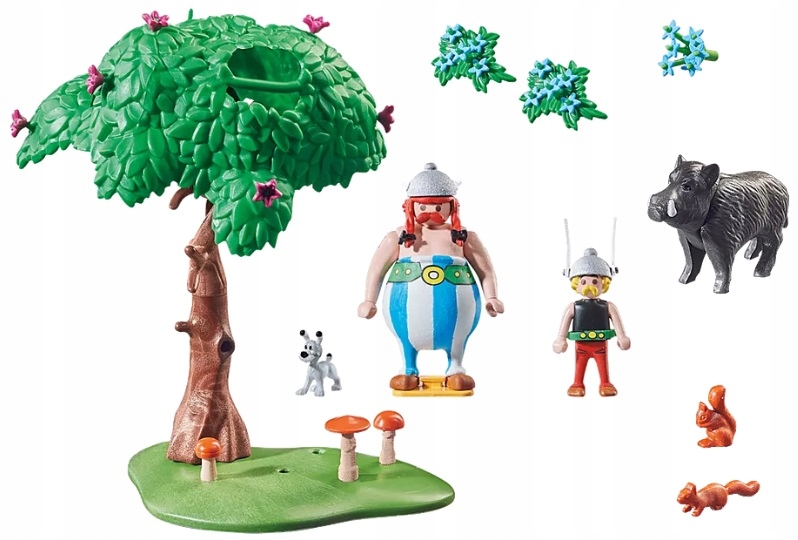 Zabawka PLAYMOBIL Asterix zawiera Galów Asterix i Obelix, psa Idefix, dwie wiewiórki, dzika i drzewo. Obelix może unieść dzika i odłożyć zwalone drzewo.