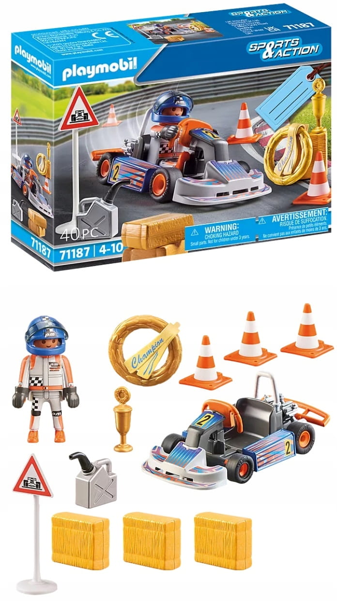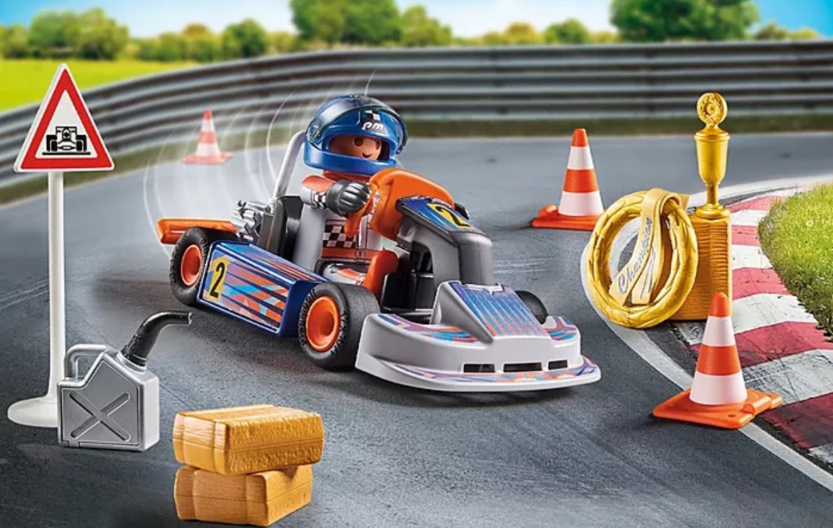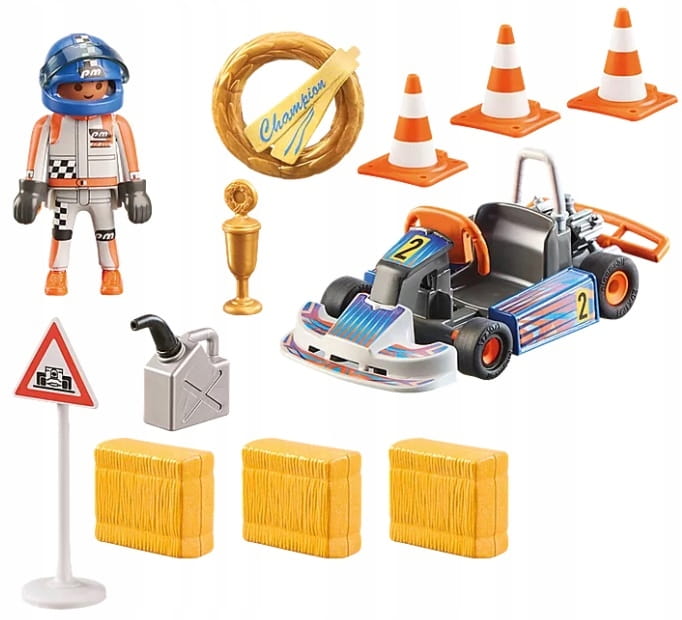 Zestaw upominkowy PLAYMOBIL składa się z kierowcy wyścigowego PLAYMOBIL, gokarta, trzech pylonów, trofeum, wieńca i innych wspaniałych akcesoriów wyścigowych. Gokart można tankować za pomocą kanistra. Dzięki ozdobnemu pudełku i plakietce do pisania, zestawy podarunkowe PLAYMOBIL oszczędzają papier do pakowania, a tym samym chronią środowisko. Świetny zestaw zabawek do zabrania do domu i rozdania.