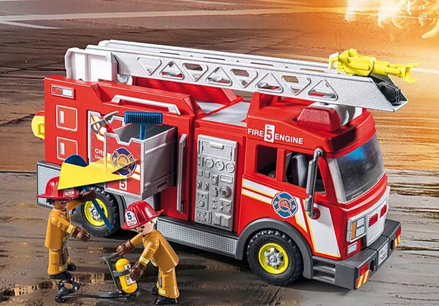 Zostań bohaterem w PLAYMO City z wozem strażackim PLAYMOBIL wyposażonym w wysuwaną drabinę, która obraca się o 360 stopni, oraz obracającą się i obracającą się armatkę wodną do gaszenia płomieni.