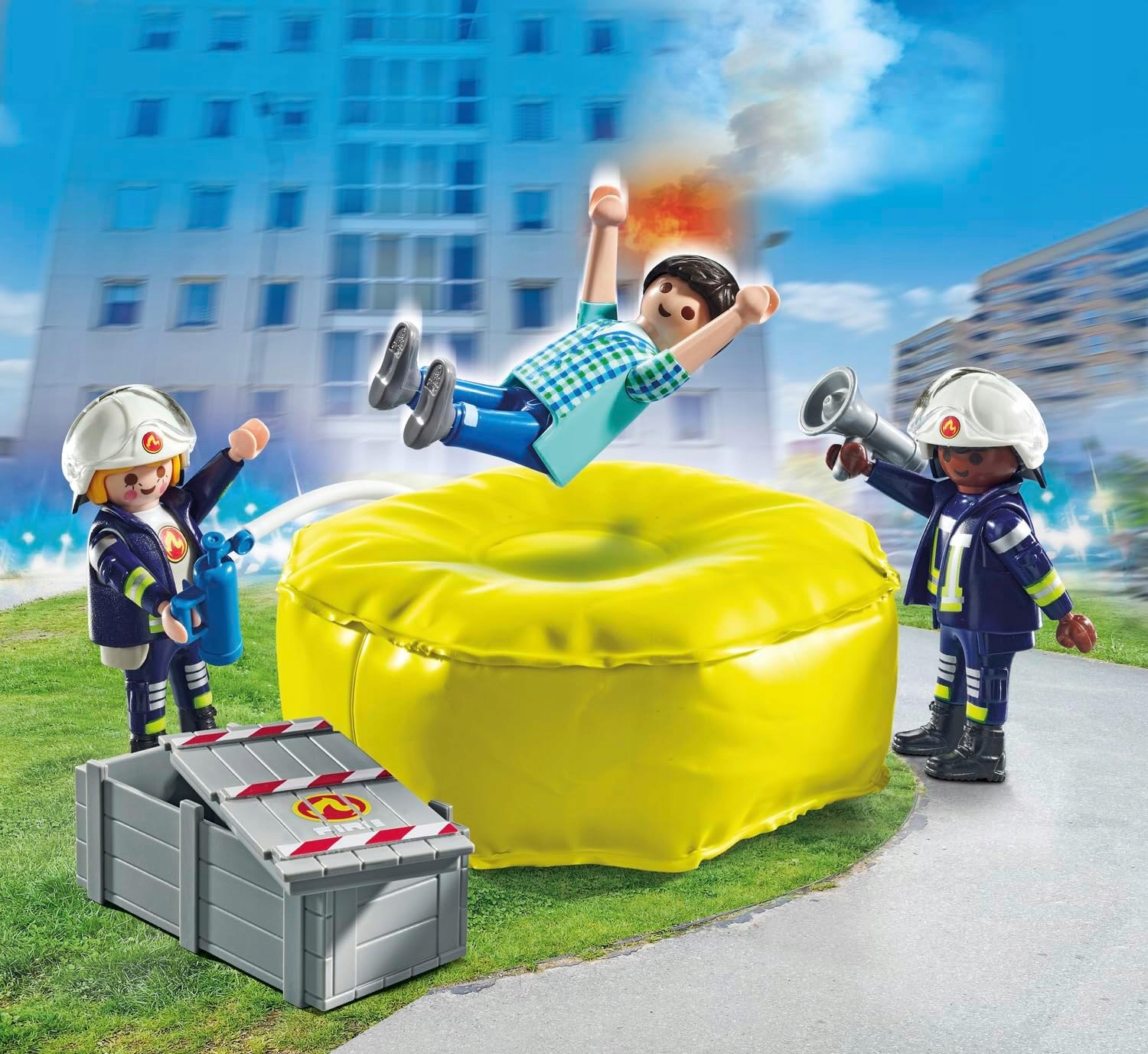 Dwóch odważnych strażaków wyposażonych w poduszkę powietrzną niesie pomoc na miejscu zdarzenia. Poduszkę można napełnić powietrzem, a praktyczna zatyczka utrzymuje je w jej wnętrzu. Po zabawie można wypuścić powietrze, a poduszkę przechowywać w dwuczęściowym pudełku. Co za oszczędność miejsca! Hełmy strażackie figurek można zdejmować, co pozwala na realistyczne odgrywanie ról. Bogato wyposażony zestaw do ciekawych przygód, który nie tylko rozwija kreatywność, ale także umiejętności społeczne i rozumienie bezpieczeństwa.