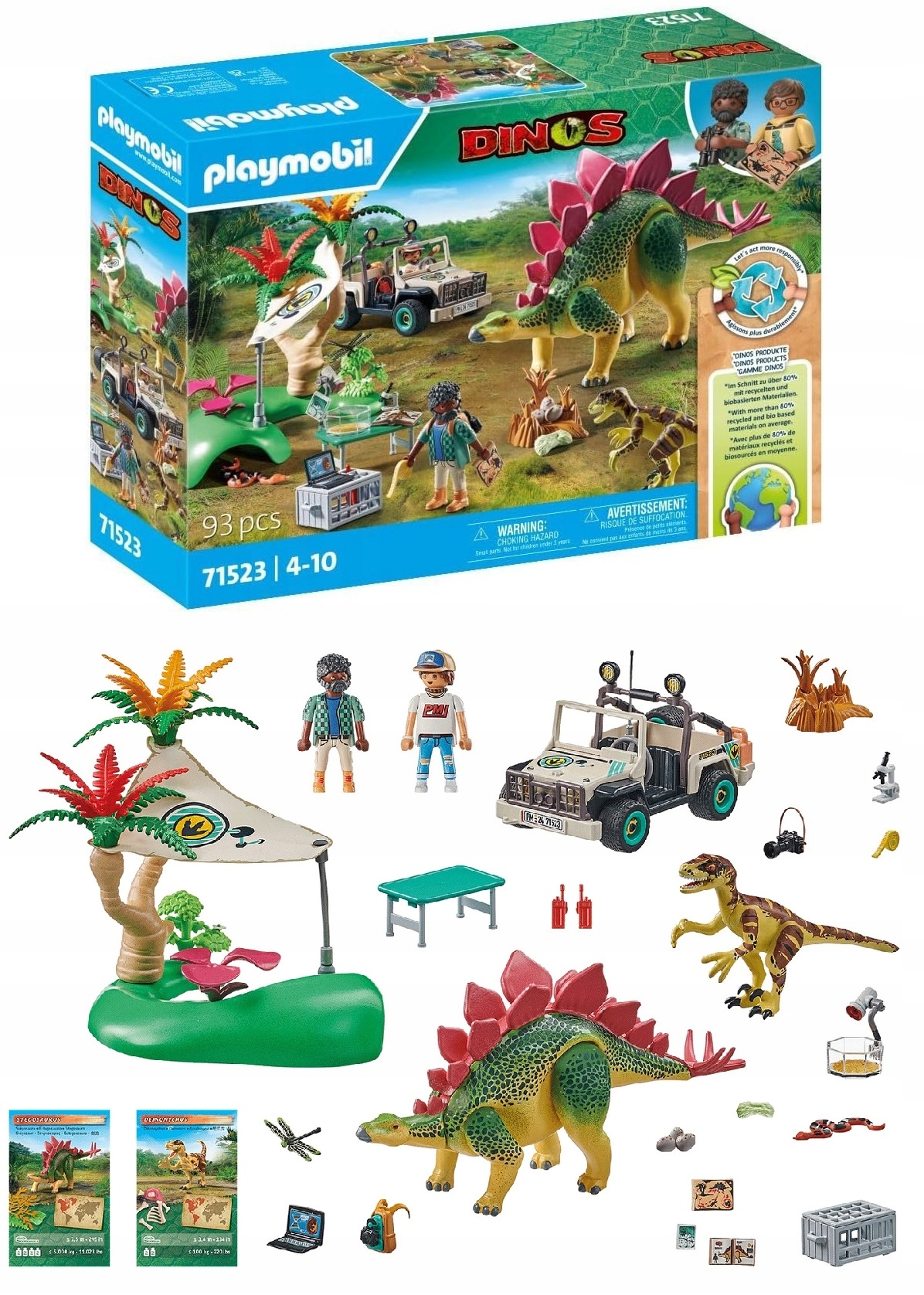 Po pouczającej przejażdżce spotykają w obozie Stegozaura i bezczelnego Deinonychusa, który zbliża się do jaj dinozaurów ze złodziejskimi zamiarami. Zawiera dwie karty wiedzy o dinozaurach. Przygotuj się na niezapomniane przygody w obozie badawczym z dinozaurami PLAYMOBIL. Badacze wyruszają na ekspedycję do dżungli, aby dowiedzieć się więcej o tajemniczych prehistorycznych gigantach. W swoim obozie dokonują pomiarów, badają jaja i próbki pod mikroskopem oraz gromadzą ważne informacje. Podczas odkrywczej wycieczki pojazdem terenowym natrafiają nawet na Stegozaura i Deinonychusa.