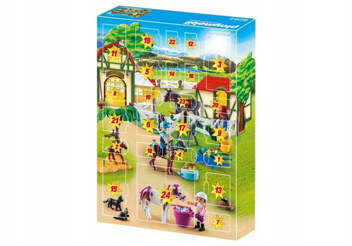 Kalendarz Adwentowy to moc niespodzianek ukrytych za 24 drzwiczkami - po jednej na każdy z 24 dni adwentu. Dzieci wprost uwielbiają odliczać z niecierpliwością dni do Wigilii Bożego Narodzenia, a ukryte w okienkach zabawki przyniosą wiele radości i sprawią, że oczekiwanie na święta będzie jeszcze bardziej ekscytujące. Kalendarz o tematyce stadniny, to mnóstwo fantastycznych akcesoriów i figurek związanych z uwielbianą przez dzieci tematyką. W okienkach kalendarza podczas kolejnych dni adwentu dzieci będą odkrywać kolejne elementy do rozbudowy playmobilowej kolekcji związanej z zawodami jeździeckimi.