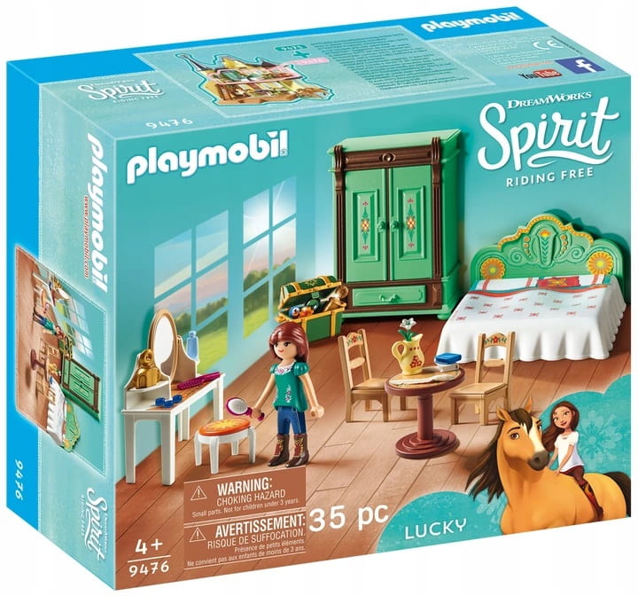 Przytulnie umeblowany pokój Lucky z toaletką i skrzynią pełną skarbów. W zestawie znajduje się także łóżko, duża szafa, stoliczek i dwa krzesła. Oraz figurka Lucky i wiele innych dodatków. Figurka może się zginać, siedzieć, stać i obracać głową. Sypialnia Lucky to wspaniały komplet uzupełniający do Szczęśliwego domu Lucky 9475 - sprzedawanego oddzielnie lub niezależny zestaw do zabawy figurką i akcesoriami Playmobil.