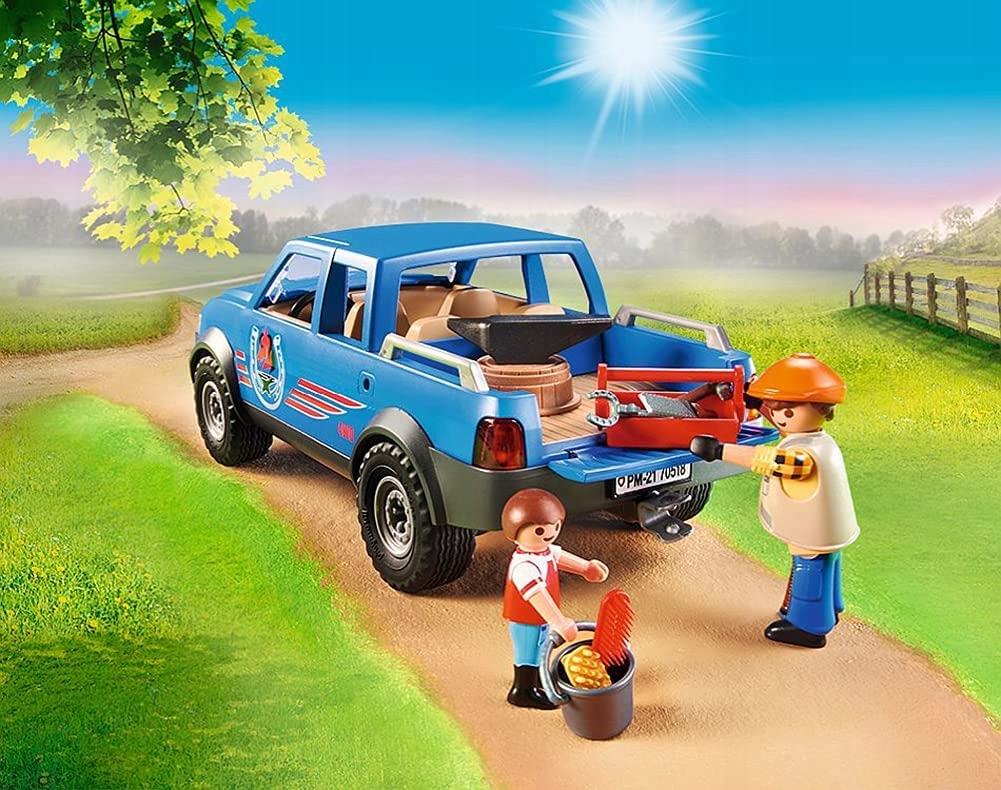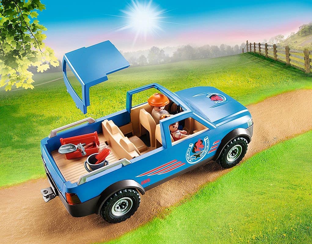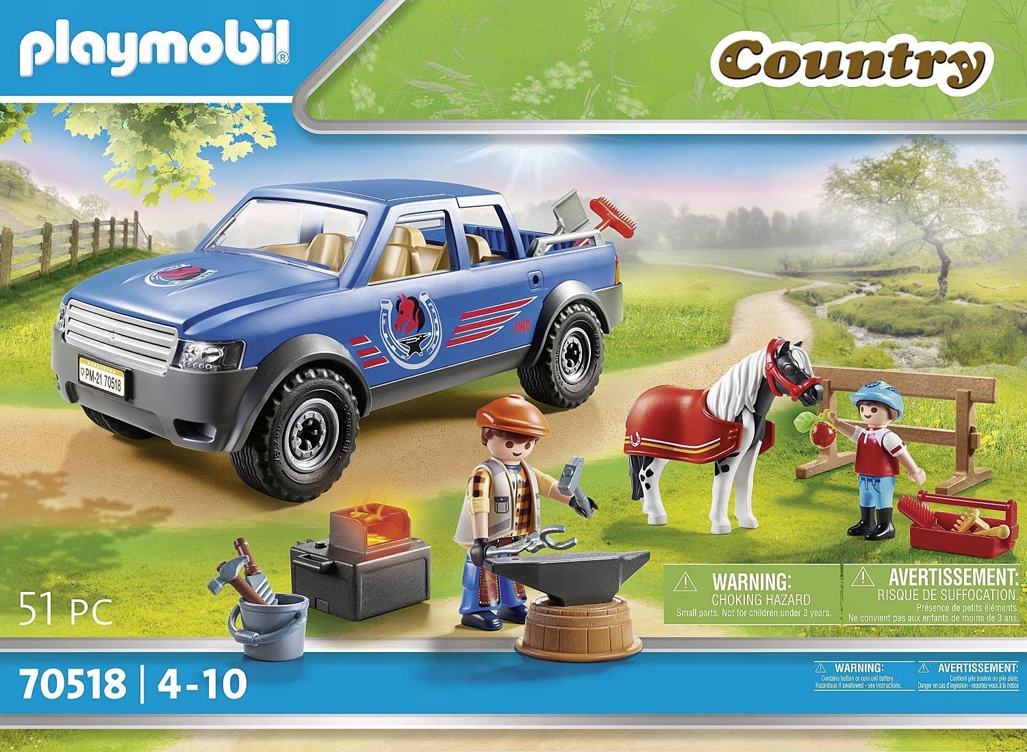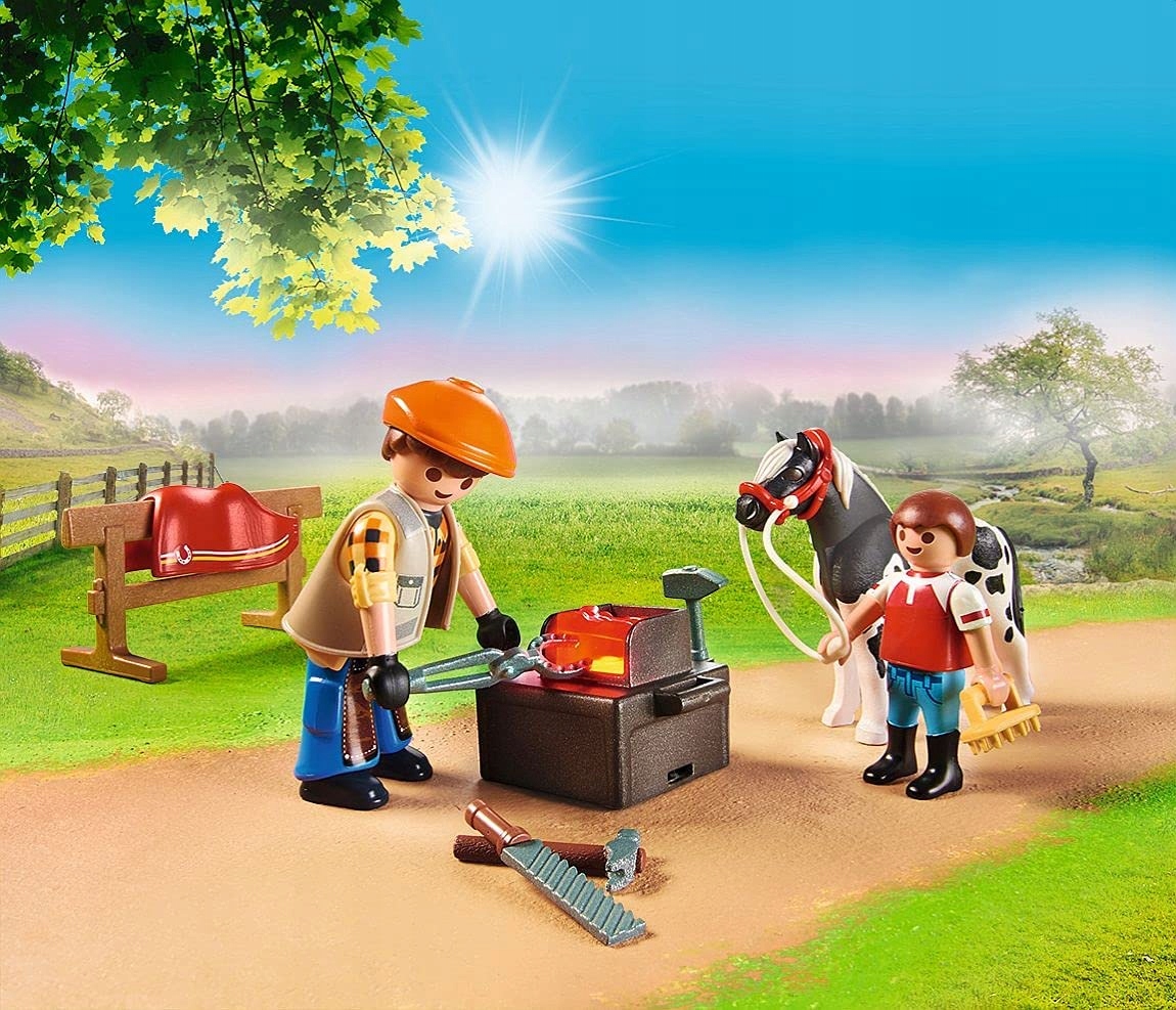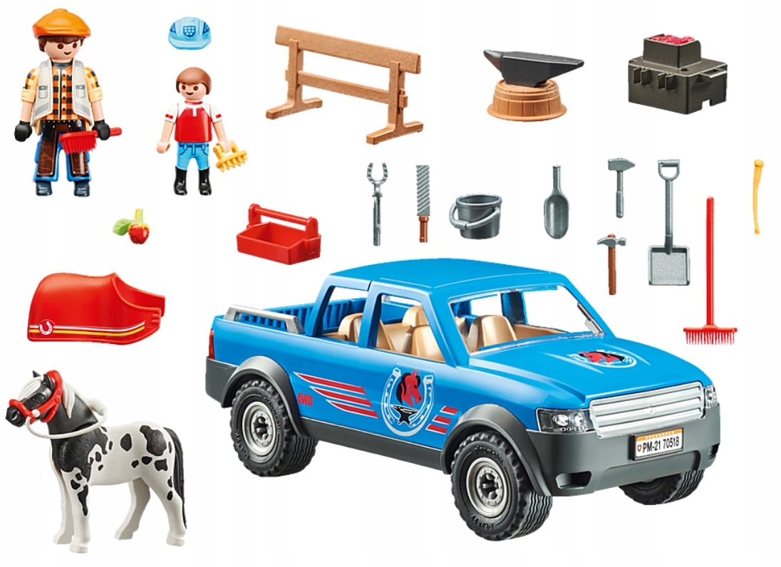 W Ponyhof zawsze jest tak wiele do przeżycia. Ogłoszono dziś że przyjedzie mobilny kowal. Właśnie wjeżdża na podwórze swoim niebieskim pick-upem. Na przestrzeni ładunkowej przestronnej ciężarówki ma ze sobą wszystko: kowadło, kuźnię, szczypce, młotek, pilnik i łopatę. Umiejętnie sprawdza kopyta kucyków. Jest tam dużo do zrobienia. Kowal rozpala ogień i przygotowuje wszystko do podkuwania koni. Na koniec dnia wszystkie kucyki są wyposażone w nowe podkowy. Zestaw do zabawy zawiera figurkę PLAYMOBIL, kucyka, pick-upa z zaczepem do przyczepy, mobilną kuźnię z uchwytami, kowadło, młotek, szczypce z podkową, łopatę i wiele innych akcesoriów. Węgle kuźni można rozpalić za pomocą przycisku z boku i automatycznie zgasną po 90 sekundach.