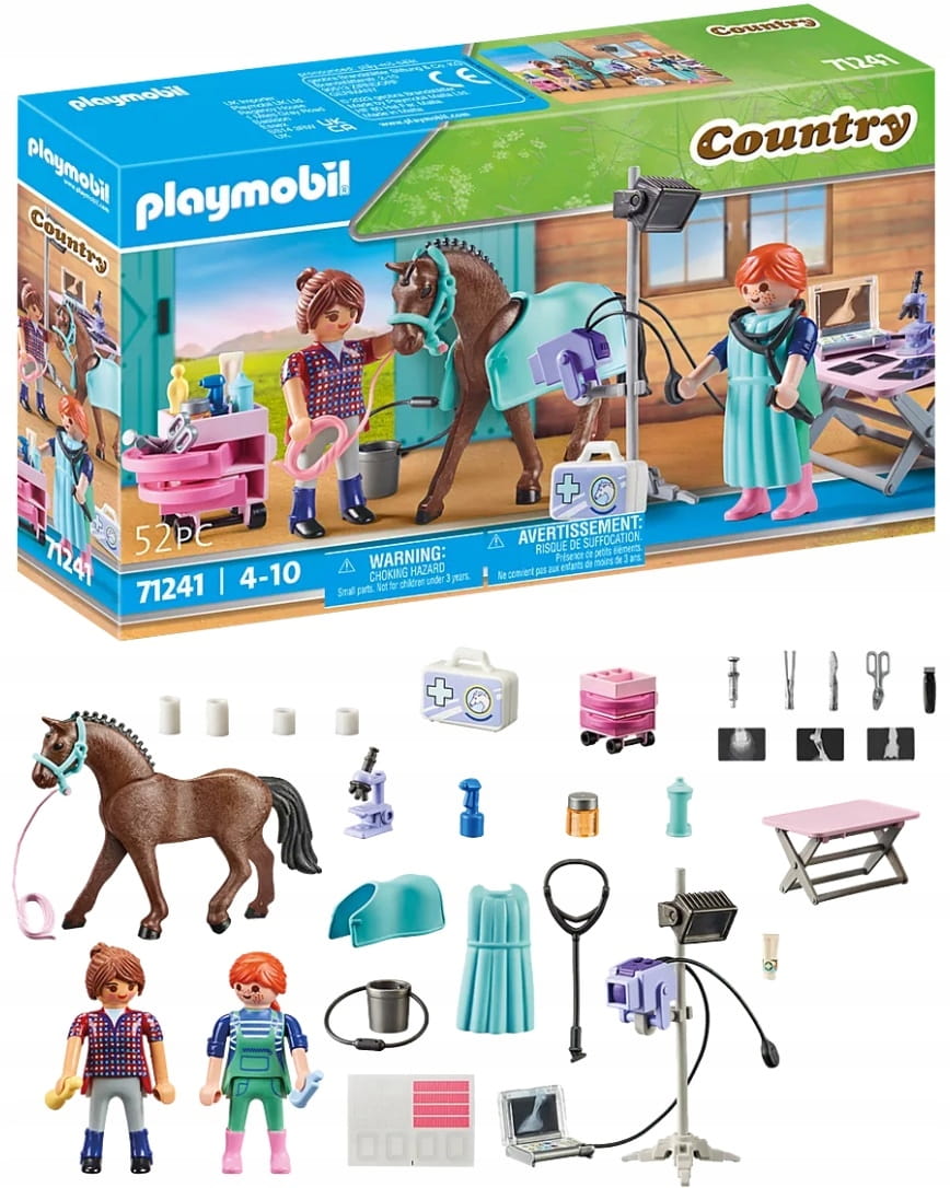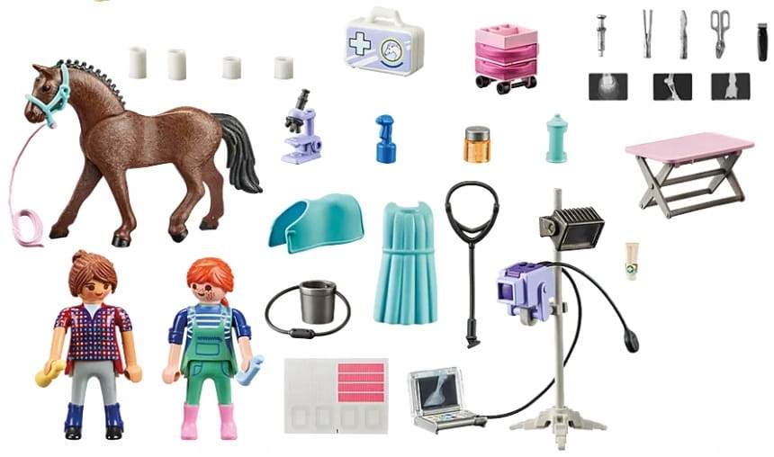 52-częściowe pudełko z zabawkami zawiera figurkę PLAYMOBIL, konia, mobilny aparat rentgenowski, różne akcesoria lekarskie i arkusz etykiet z naklejkami na bandaże. Ten zestaw do zabawy można również idealnie połączyć z innymi zestawami jeźdźców ze świata tematycznego PLAYMOBIL Country.
