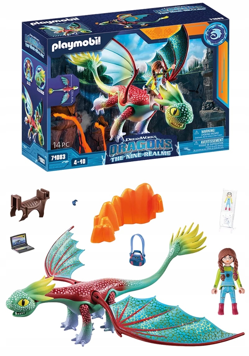 Dzięki zestawowi Feathers & Alex firmy PLAYMOBIL małe i duże przygody ze smokami można teraz rozgrywać także w domu. Nogi, głowa i skrzydła figurki smoka są ruchome. Pióra z tyłu głowy i ogona wykonane są z miękkiego materiału. Zamontowane siodło pozwala figurce usiąść na grzbiecie smoka.
