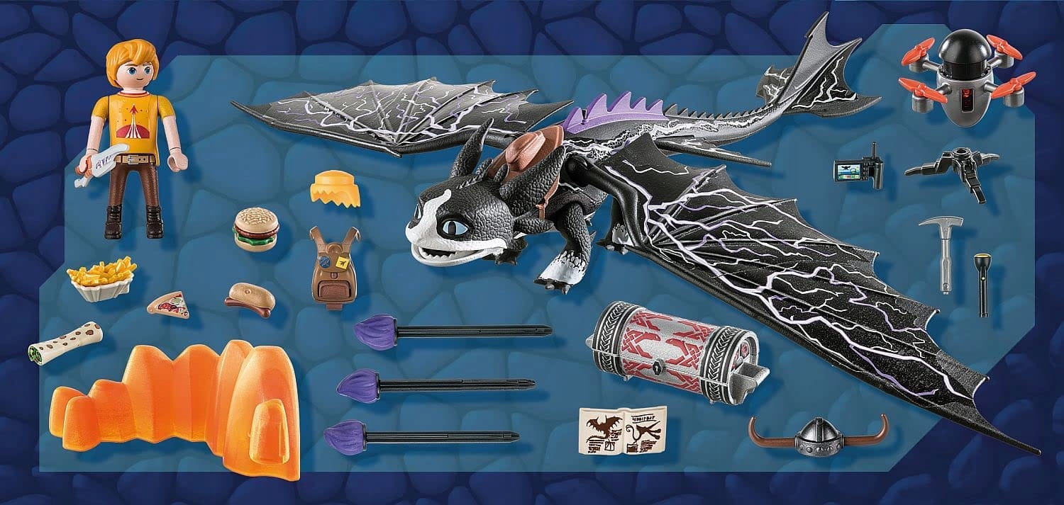 Dzięki zestawowi do zabawy Thunder & Tom firmy PLAYMOBIL zabawa ze smokami wraca teraz do domu. Thunder może poruszać wszystkimi czterema nogami, a także głową i skrzydłami. Zintegrowane siodło pozwala Tomowi jeździć na Thunder. Grzbietowy grzebień Thundera jest wyposażony w moduł świetlny i może strzelać plazmowymi strzałkami z ust. Aby to zrobić, strzała jest wkładana do paszczy smoka, a następnie zamykana. Naciskając głowę lub uszy, strzała jest ponownie wystrzeliwana z ust.