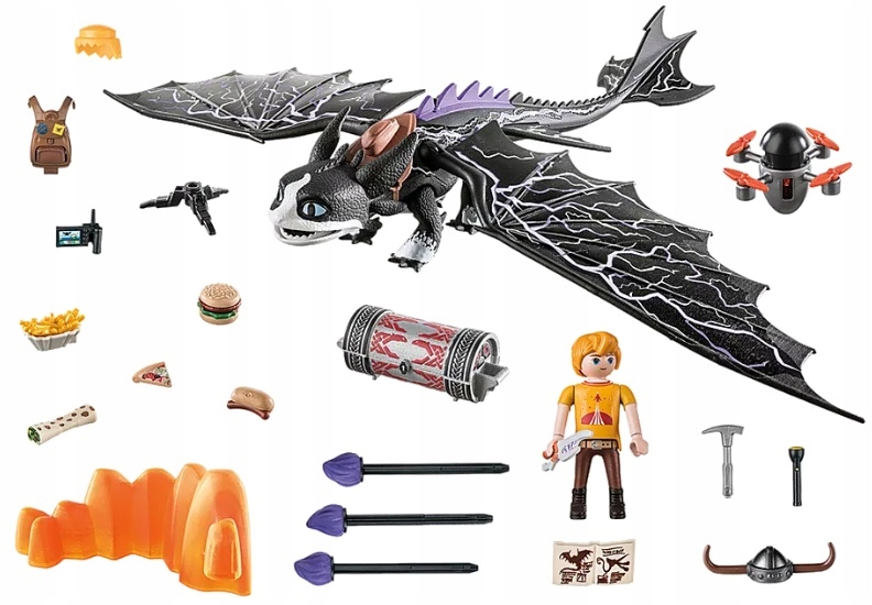 Zestaw do zabawy zawiera smoki: postacie z Dziewięciu Królestw, Toma Kullersena i jego smoka Grzmot z modułem świetlnym i funkcją strzelania, trzema strzałami, hełmem wikinga, dronem, latarką i innymi wspaniałymi dodatkami.