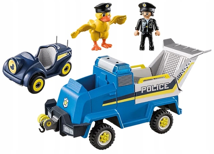 Oszuści w biegu! Ale nie na długo, bo Polly Police ruszyła już w pościg w swoim policyjnym samochodzie. Ale nagle droga robi się zbyt wąska i nie może jechać dalej. Na szczęście jest tam Kaczka ze swoim mini radiowozem. Polly składa mu tylny spojler pojazdu uprzywilejowanego i ruszamy! Zestaw do zabawy składa się z dwóch figurek PLAYMOBIL oraz radiowozu z innowacyjnym uchylnym układem kierowniczym, wyciągarką i tylnym spojlerem oraz dodatkowego mini-pojazdu policyjnego.