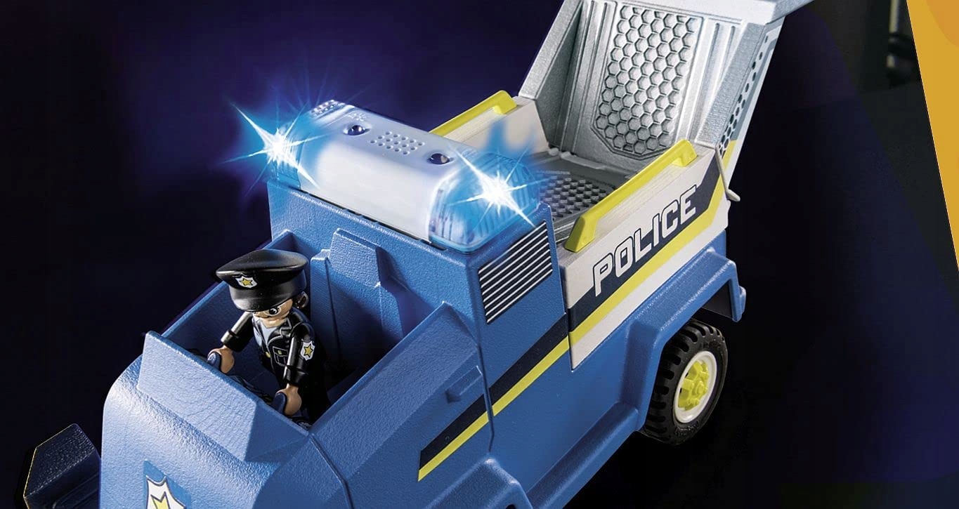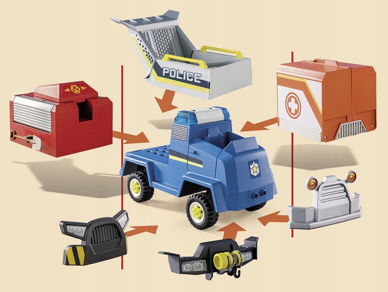 - Akcesoria: 1 radiowóz z odchylanym układem kierowniczym i modułem światła i dźwięku, a także składany tylny spojler, wyciągarka linowa i schowek, 1 mini radiowóz.