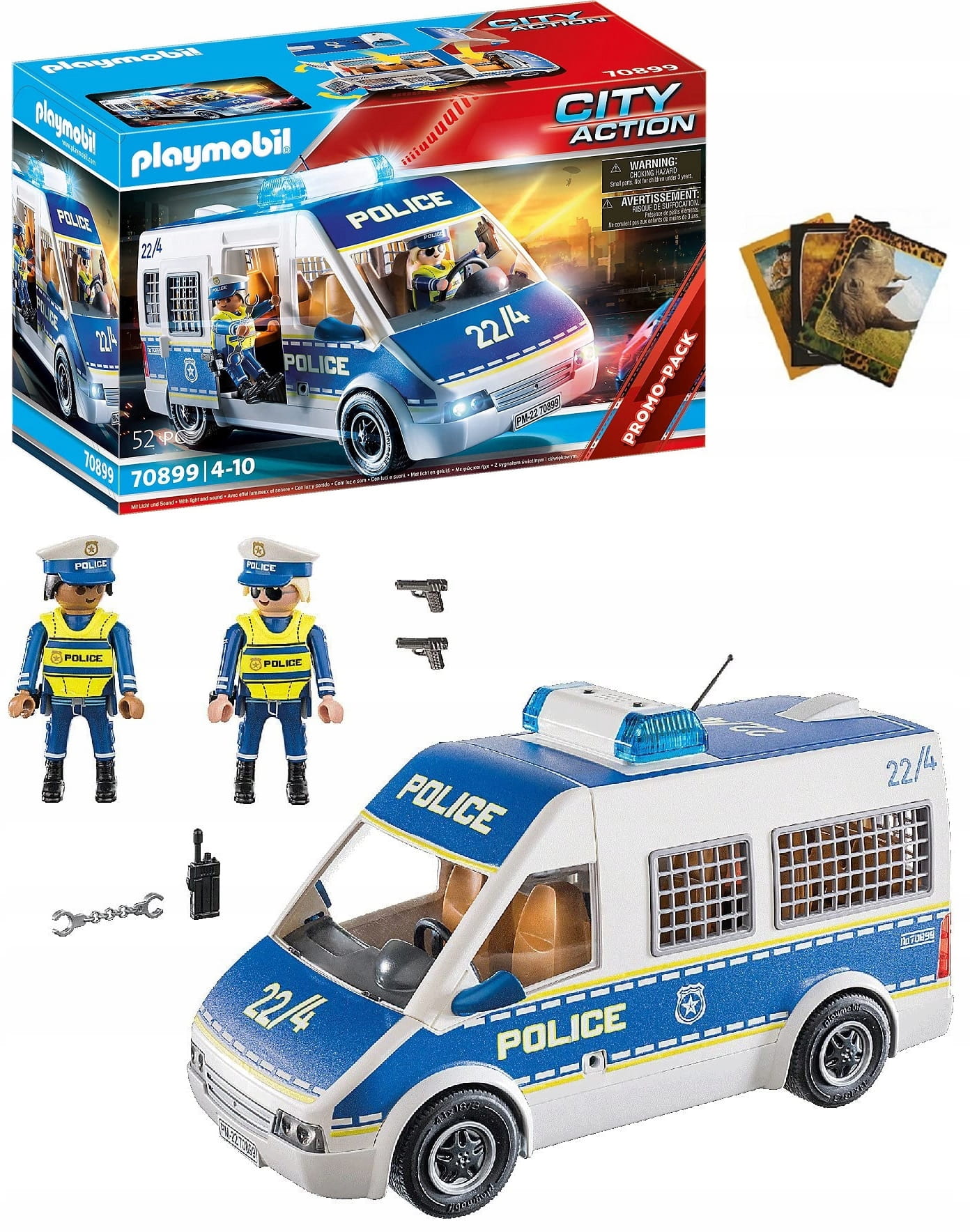 Zestaw składa się z dwóch policjantów PLAYMOBIL, policyjnego busa, dwóch policyjnych czapek, dwóch kamizelek i innych dodatków do ekscytujących akcji policyjnych. Dachy kabiny kierowcy i przedziału pasażerskiego można zdemontować, a boczne drzwi przesuwne odchylają się na zewnątrz. Przycisk na spodzie pojazdu służy do przełączania między dwoma dźwiękami syreny.